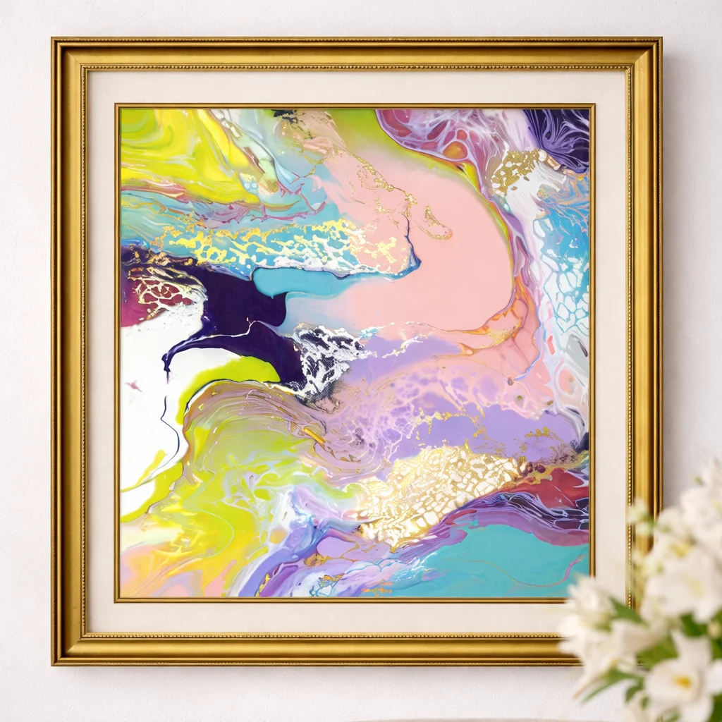 Soft streams of turquoise, blush, and lilac flow into a dramatic encounter with deep violet tones, while touches of gold scatter like broken light across the surface. The piece captures a living moment of motion โ suspended between calm and intensity, softness and strength.