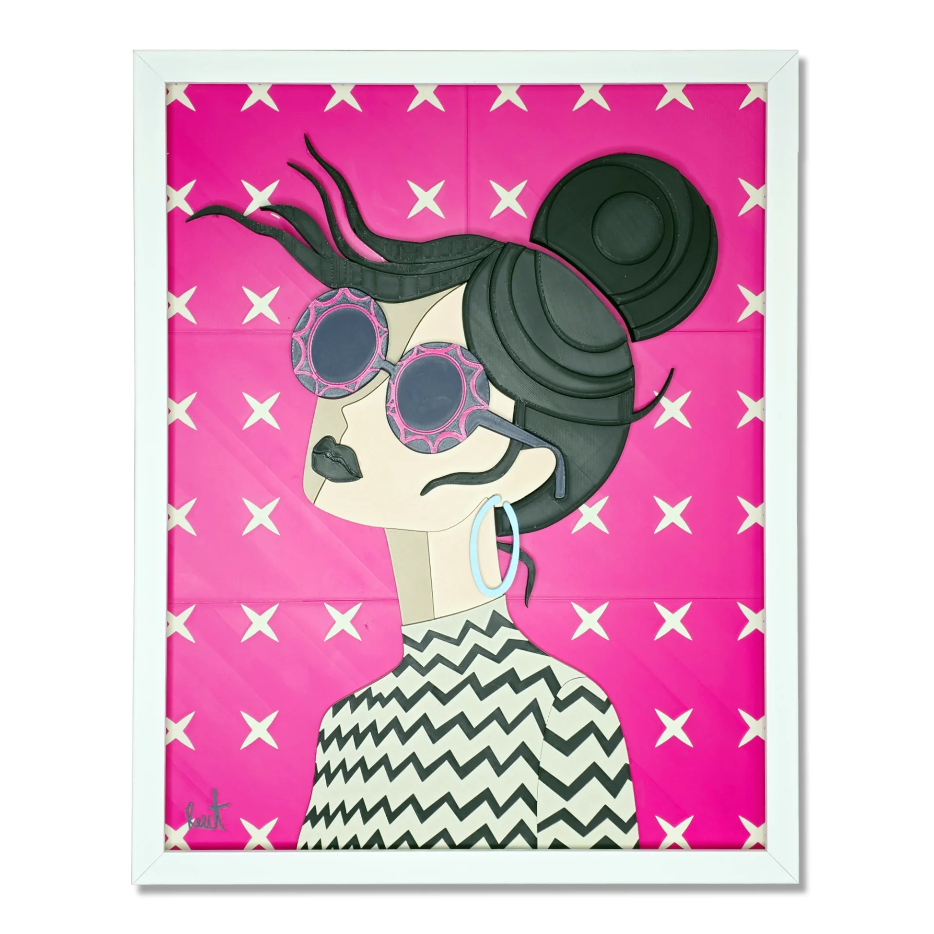 A focused and relaxed gaze, emphasized by sculpted textures and a striking graphic backdrop. The blend of three-dimensional depth and clean lines creates an elegant, stylish, and captivating presence.
