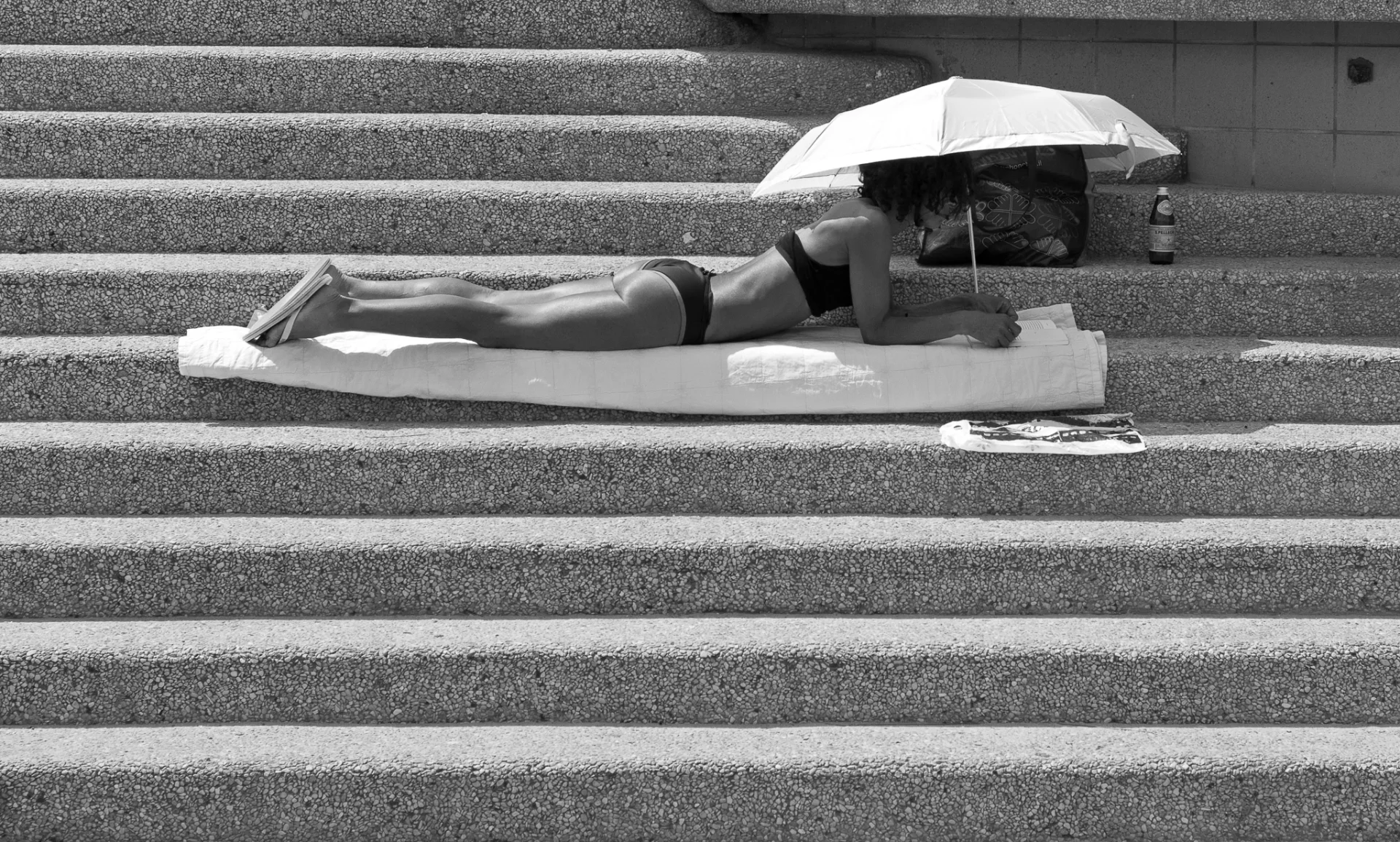 A black-and-white photographic work capturing a quiet summer moment on urban steps, where a reclining female figure under a white umbrella creates a striking balance of geometry, light, and intimacy. Printed on paper, the image combines documentary observation with a refined, minimalist composition.