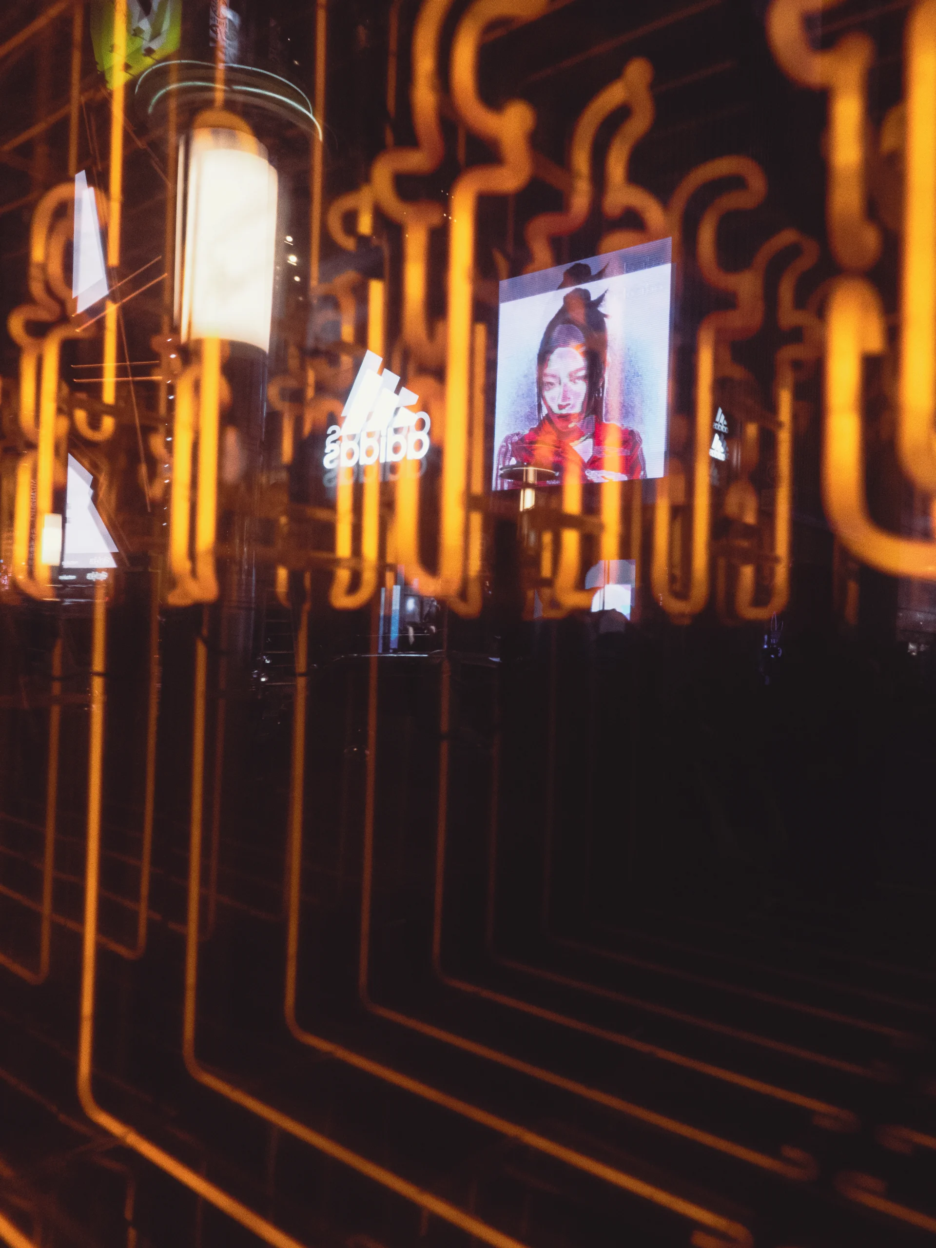 Reflections, illuminated signage, and screens converge into a dense urban surface. The human figure shifts from physical presence into a layered digital narrative, gradually dissolving within the surrounding visual noise. The image reflects a quiet loss of orientation, where individuality is absorbed into the rhythm and flow of contemporary visual culture.