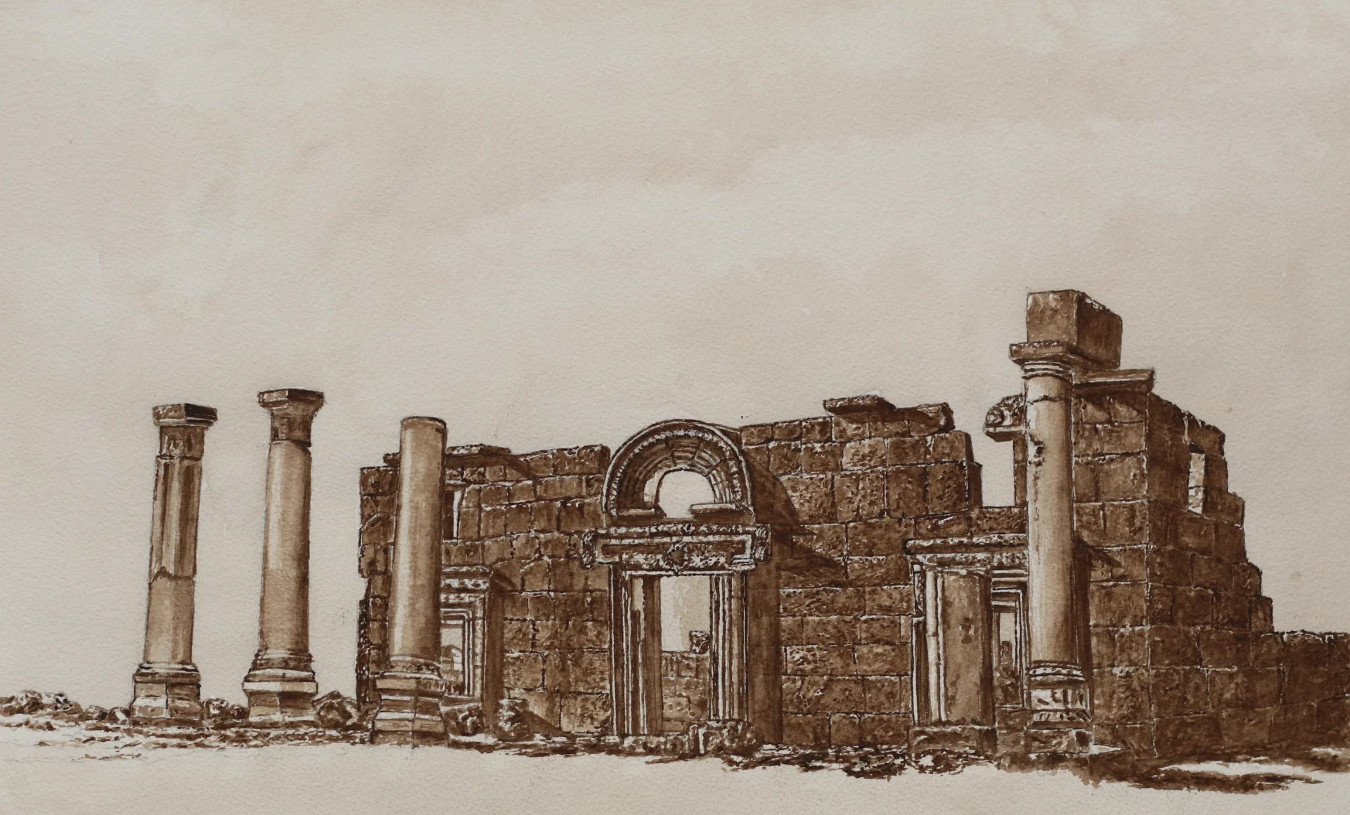 Watercolor painting on paper of the remains of the facade of the ancient synagogue in Baram in the Galilee.