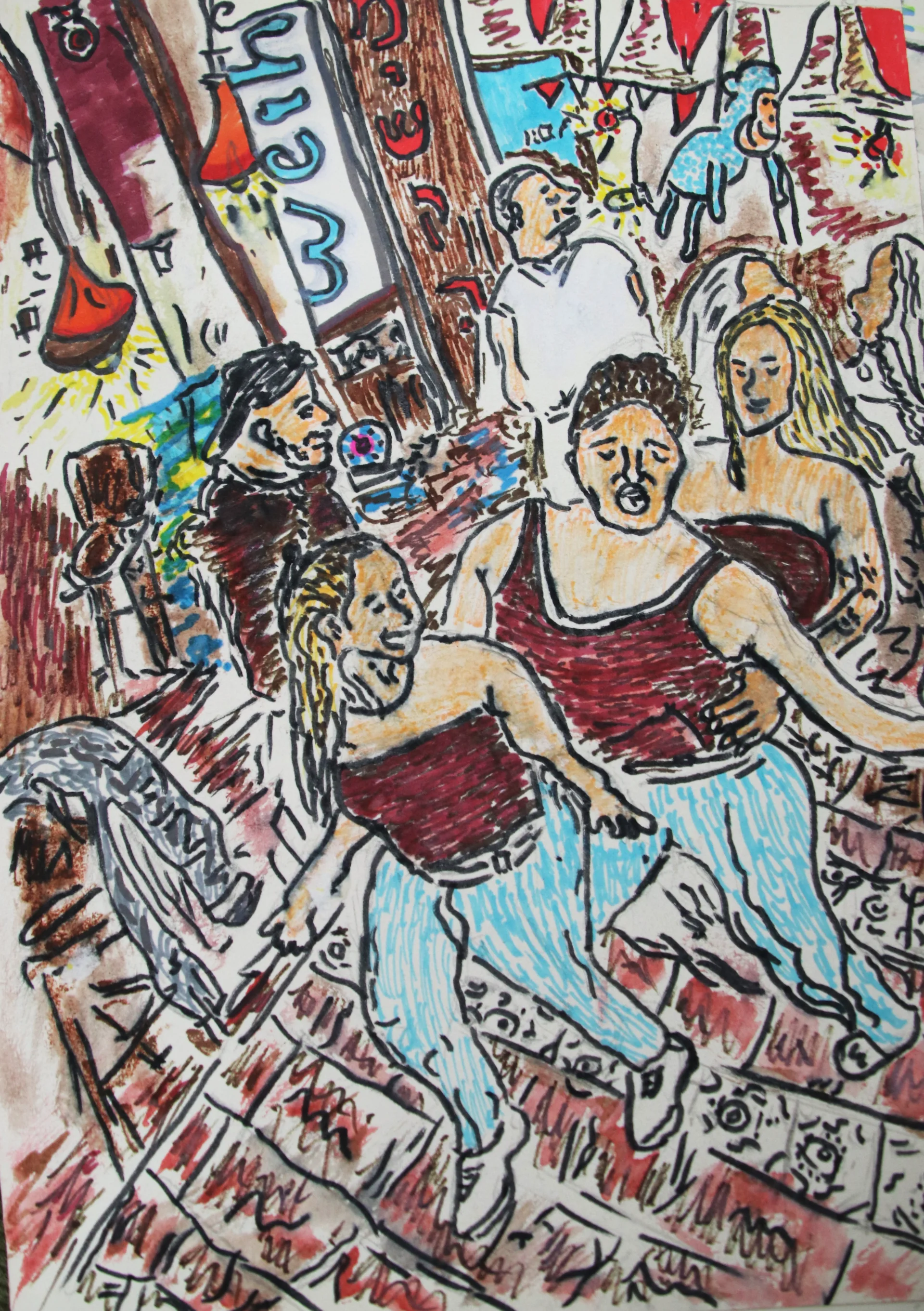 Artist: Daniel Avraham Hadad Medium: Mixed Media (Marker drawing, Outlining pen, and Watercolors) on paper Dimensions: 30x21 cm About the Artwork: In this vibrant and energetic piece, artist Daniel Avraham Hadad captures a singular moment of joy from the nightlife at "Mishka" Bar. While enjoying a beer on a regular evening, Hadad found himself captivated by the hypnotic energy of the dance floor. This painting was born from an artistic impulse to immortalize the magnificent sight of women dancing together in pure, uninhibited happinessโa magical moment that reminds us of the beauty found in life's simple pleasures. The composition is full of motion, depicting a living dialogue between the dancing figures, the bar's warm lighting, and the unique communal atmosphere of the venue. Artistic Highlights: Technique: Hadad employs marker drawing to create strong, dynamic lines that emphasize the fluid movement of the dancers. The use of a black outlining pen provides graphic depth, while the final layer of watercolors softens the space, lending it a dreamlike and evocative atmosphere. Style: The work blends elements of modern expressionism with touches of urban illustration, maintaining a sense of authenticity and raw emotion.