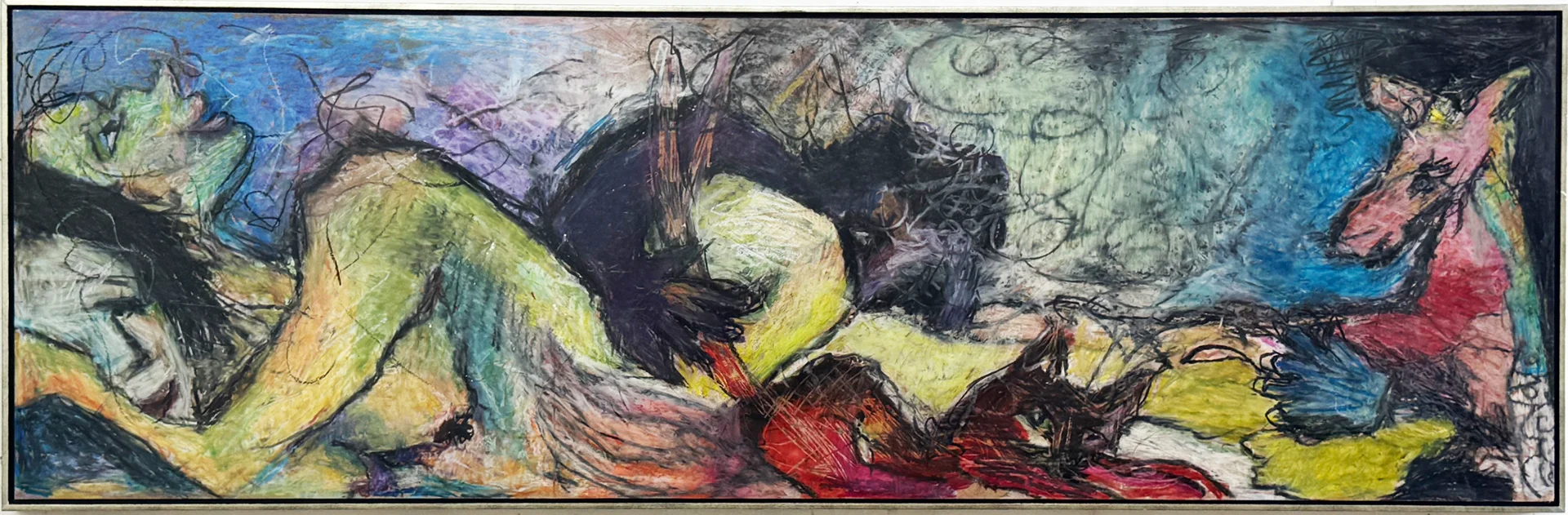 long framed in silver wood, dark pop art style painting, in free hand unique way. of couple in a love act. Very colorful and black. lots of spots lines and