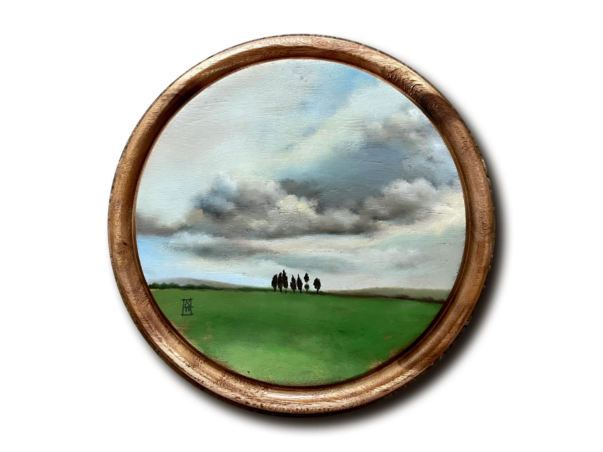 An oil painting on an old pizza board depicting a green winter field the day before a big storm. The cut marks that were carved into the board over the years participate in the work and contribute to the picture of the heavy cloudiness.