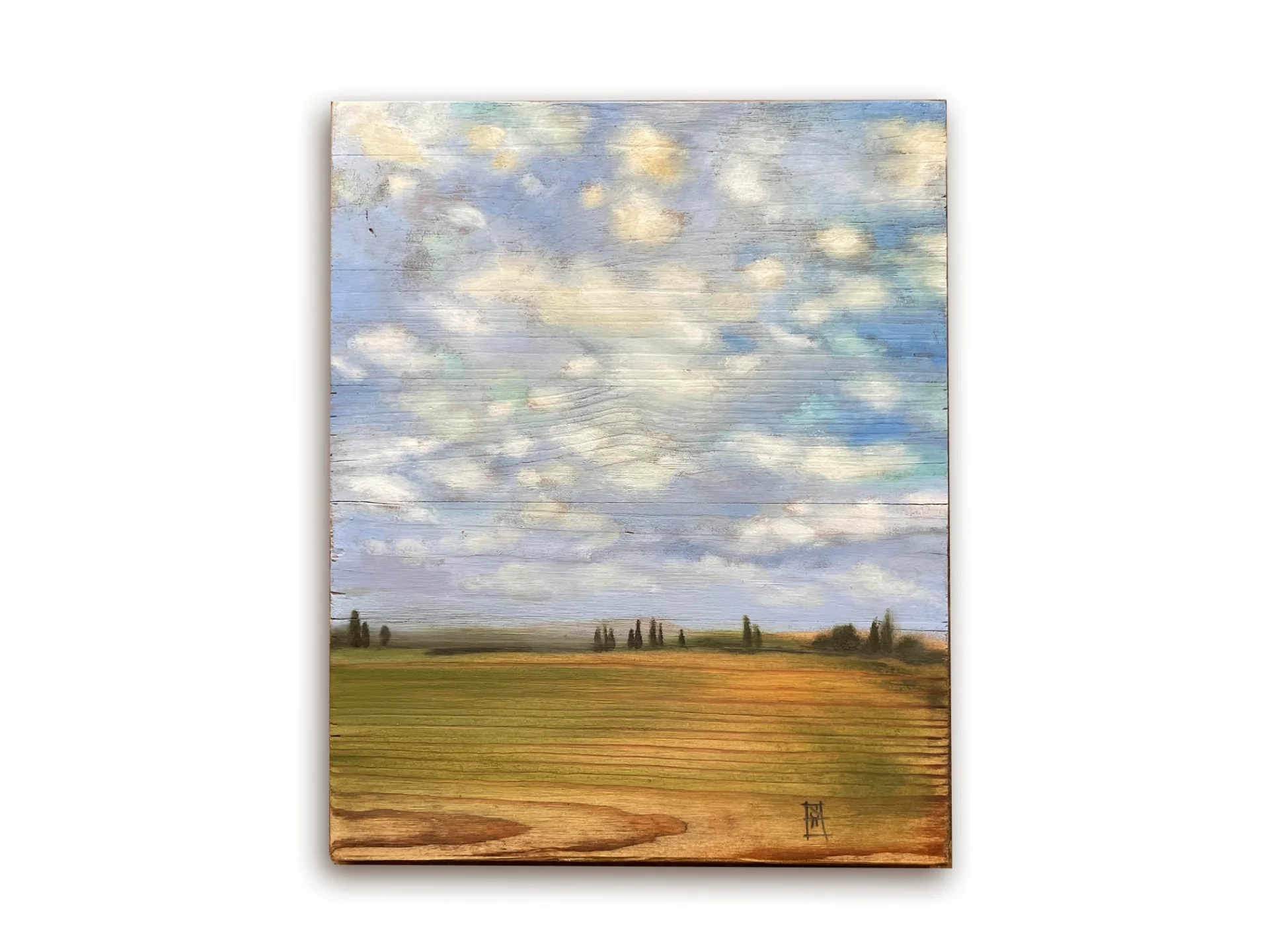 Oil on panel, open field in winter, sky glowing with a multitude of white clouds, and a distant horizon line with cypresses.