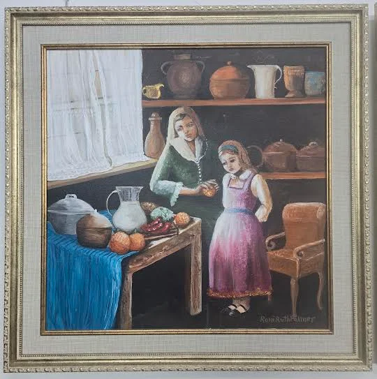 This original painting, inspired by the spirit of the Renaissance, depicts an intimate scene of everyday life in a country house. A young woman dressed in a traditional green dress and white headdress stands and delicately serves fresh fruit to her little daughter. The girl, dressed in a rich pink-purple dress, stands in front of her with a look full of curiosity and innocence. The table in front of them is covered with a rich blue tablecloth and decorated with an abundance of fruits, fresh vegetables, red peppers and traditional kitchen utensils. In the background, on dark shelves, pottery, bowls and jugs are displayed, reminiscent of Renaissance still lifes. Through a window with a transparent white curtain, soft light enters, creating an atmosphere of peace and family warmth. The painting combines the tradition of the Renaissance – the emphasis on light, precise details, textural richness and delicate emotional expression – with simple everyday life full of human grace. It celebrates the small and meaningful moment of passing on knowledge, love, and abundance from generation to generation.