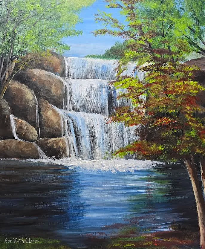 An original pastoral and colorful landscape painting depicting a wide waterfall that cascades in gentle steps between large, rounded rocks into a quiet pool at the bottom. The white, foamy water flows gently, creating a sense of natural and relaxing movement, and is reflected in deep blue tones on the surface of the peaceful lake. On both sides of the waterfall stand green, fresh trees. On the right, a tree with rich green foliage with reddish-brown touches stands out, adding depth and richness to the composition. On the left, lighter, more delicate trees balance the image and frame the waterfall in a sort of natural gate. The background opens to a bright sky in a soft, light blue hue, creating the atmosphere of a clear, quiet day. The play of light and shadow on the rocks and the surface of the water emphasizes the texture and gives a sense of depth and three-dimensionality. The painting conveys peace, harmony, and a connection to natureโa frozen moment in time where the sound of the water and the light breeze can almost be heard from within the canvas itself.