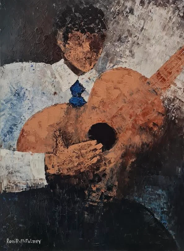 Original painting of a man playing guitar, one painting from a trio of guitar players, abstract painting in the technique of applying paint with a spatula, in a thick layer of acrylic paints. On canvas. One of a series of 3 paintings in slightly different sizes, you can purchase one or more, each unit at the same price.