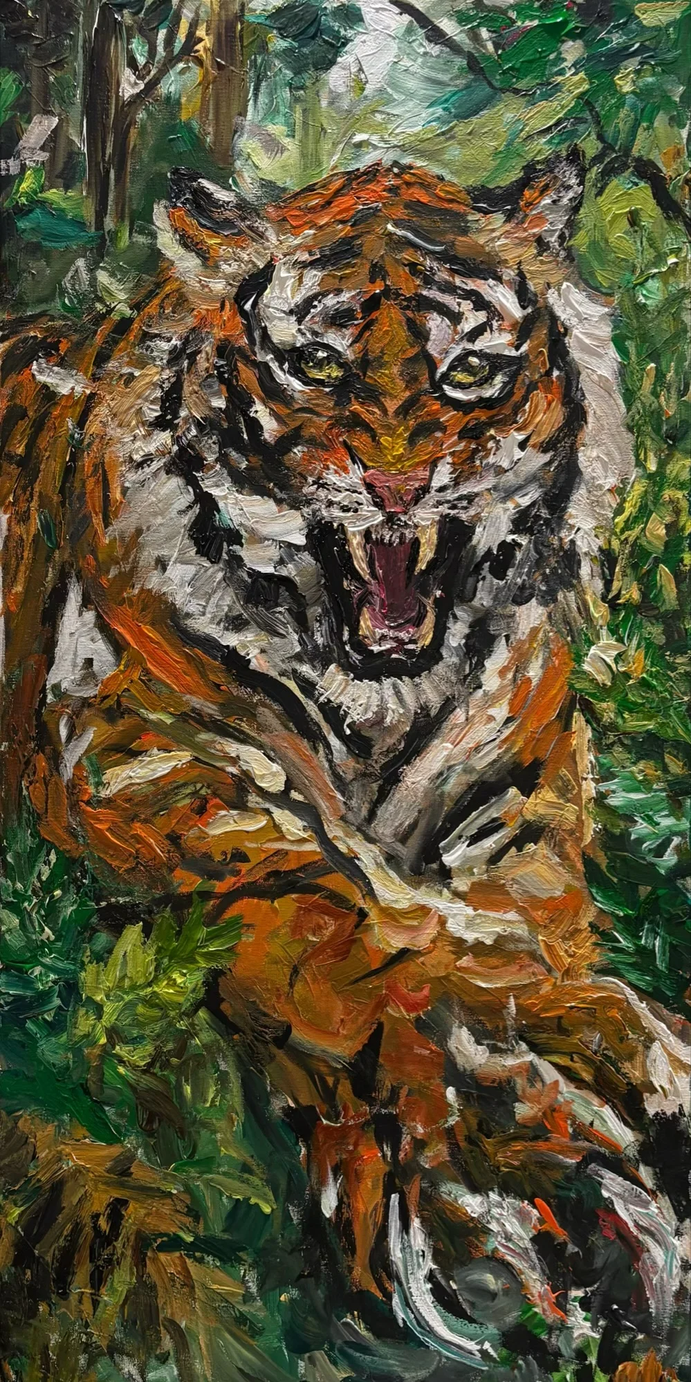 One of the most unique and powerful pieces I have ever created. A true head-turner, this painting features a massive tiger in motion through a lush green jungle. It is a work of raw power - sharp, intense, and untamed.