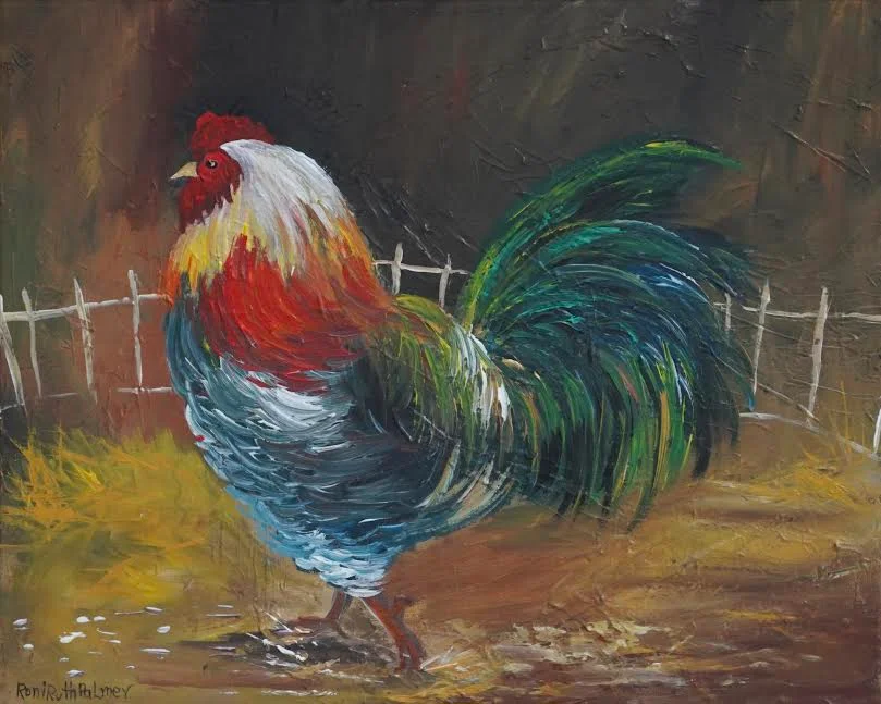 Original painting of a colorful and magnificent rooster walking on hay in the garden