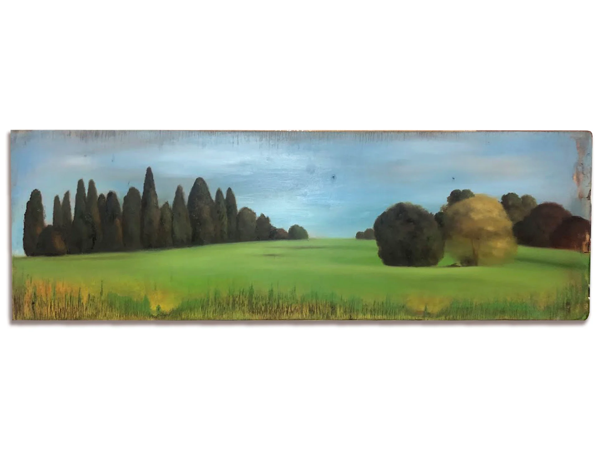 The landscape of the field that I like best, with a row of cypresses and two oak trees, green expanses and clear skies. It is an oil painting on an old wooden board.