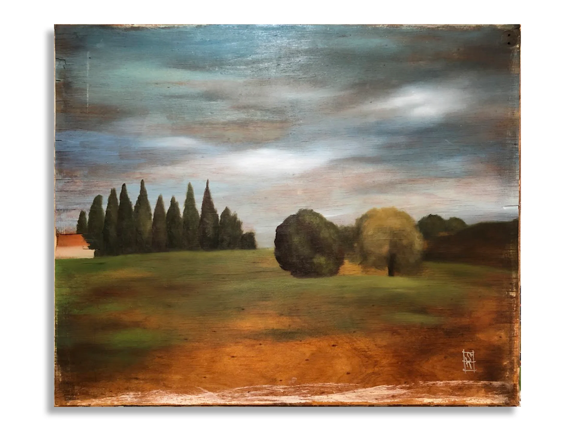 The landscape of the field that I particularly love, with a row of cypresses, two oak trees and a house. It is an oil painting on an old wooden window that was painted to order.