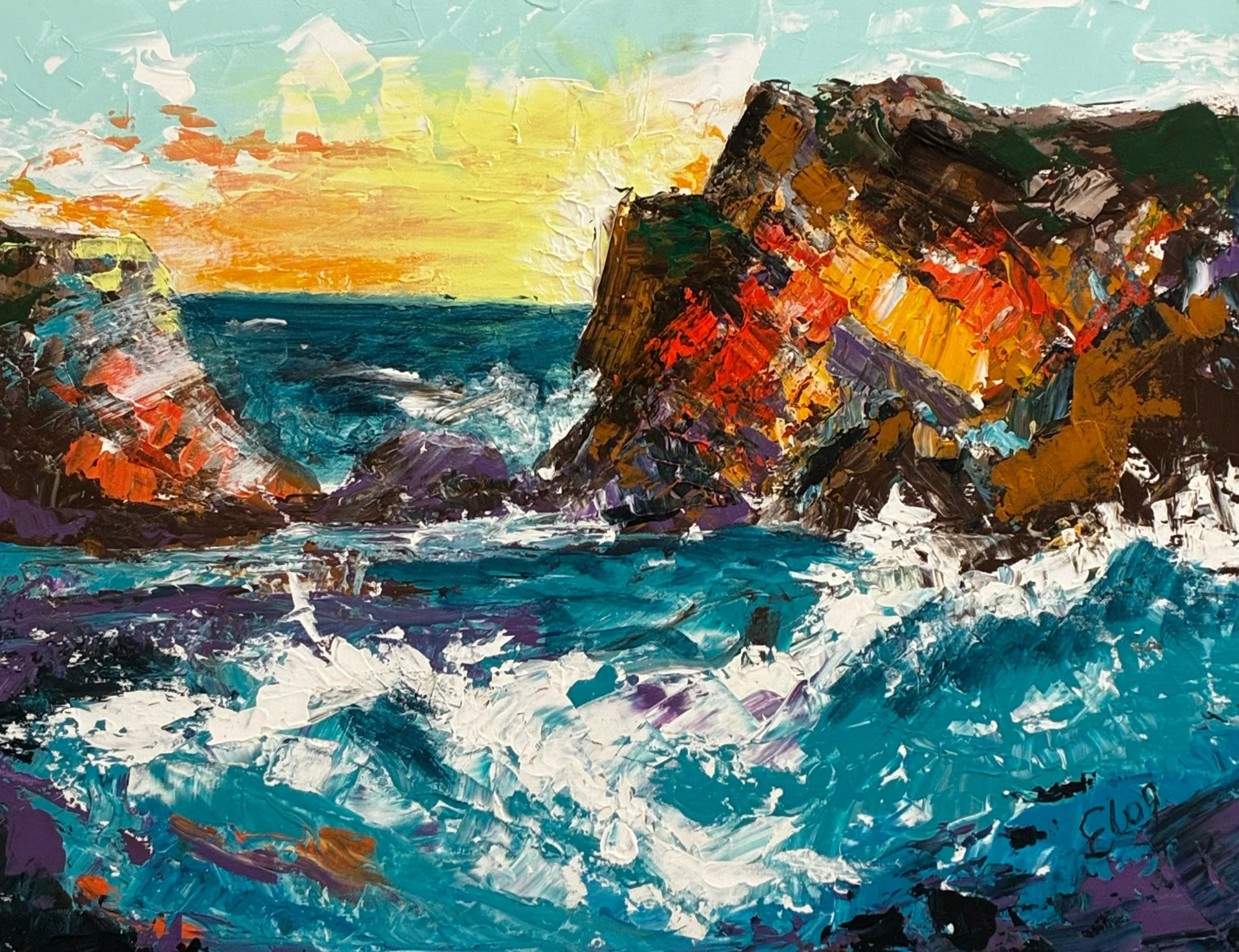 I am excited to present my new painting, created with acrylic on canvas. This expressive seascape was crafted using thick, textured brushstrokes, giving it an impressionistic character. I wanted to convey the dynamism and power of nature, captured in the moment when waves dramatically crash against rugged coastal rocks. I chose acrylic because this medium allows for vibrant and saturated colors, beautifully expressing the movement and depth of the water. The painting features shades of blue, white, and turquoise, illustrating the lively motion of the foamy water, while the rocky cliffs are depicted in bold hues of orange, purple, yellow, and green, adding energy and context to the scene. In the background, a warm sunset with soft transitions of orange and yellow blends into the sky, creating a harmony that beautifully contrasts with the cool colors of the ocean and rocks. My inspiration for creating this painting came from the strength and beauty of ocean landscapes. I wanted to capture this moment of living nature, conveying its energy and unpredictability. I hope viewers feel the same power and admiration for nature that I experienced while creating this piece.