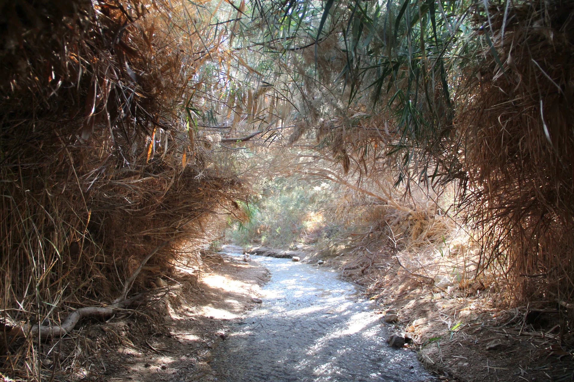 The photograph captures a breathtaking view from within a dense thicket of reeds and riverside vegetation, forming a natural archway over a flowing stream. The color palette shifts from earthy browns and dried stalks on the sides to vibrant greens above. Sunlight filters through the overhead canopy, creating a soft, ethereal glow. The water in the center reflects the light, drawing the viewer's eye deep into the hidden path, evoking a sense of tranquility and discovery.