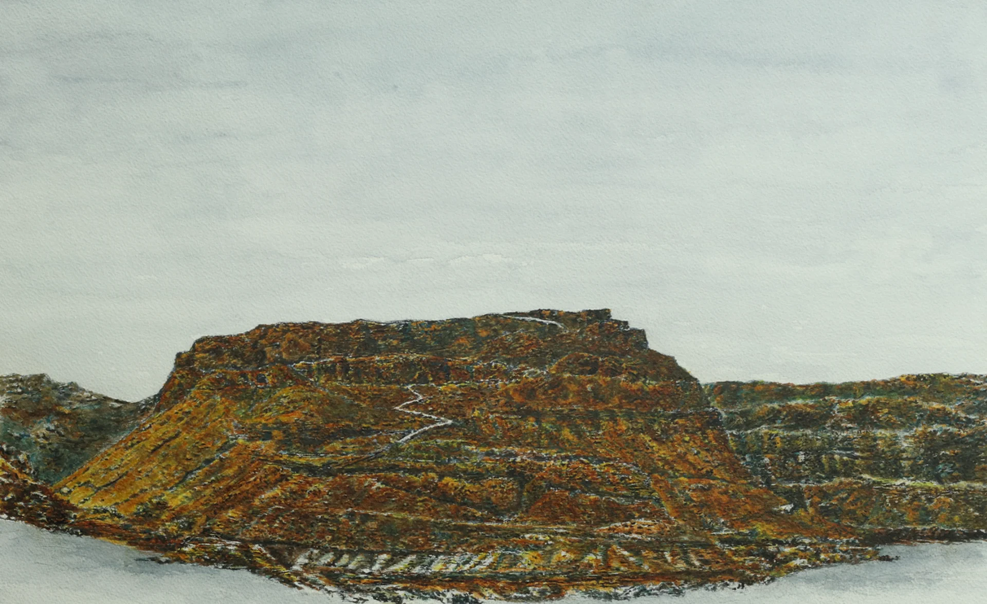 Watercolor painting on paper of the Snake Trail climbing towards the peak of Mount Masada.