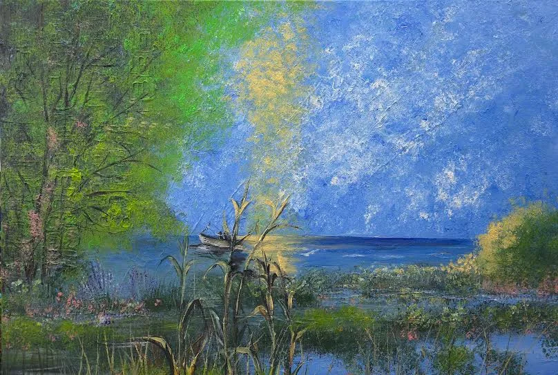 This original painting reveals a landscape full of atmosphere and emotion. A small boat with fishermen peacefully sails across deep blue water, surrounded by bright green and a dramatic sky full of movement. The foreground is filled with tall reeds, delicate wildflowers, and lush vegetation, creating a sense of living, breathing nature. The trees on the left, with touches of pale pink, rise into the intense blue-purple sky, where golden sunlight breaks through the clouds and illuminates the water and the boat. The painting combines soft realism with impressionistic expression, with bold brushstrokes and rich colors. It captures the quiet and complete moment of nature, where man and landscape merge in perfect harmony – a moment of tranquility, contemplation, and devotion to the beauty of the world.