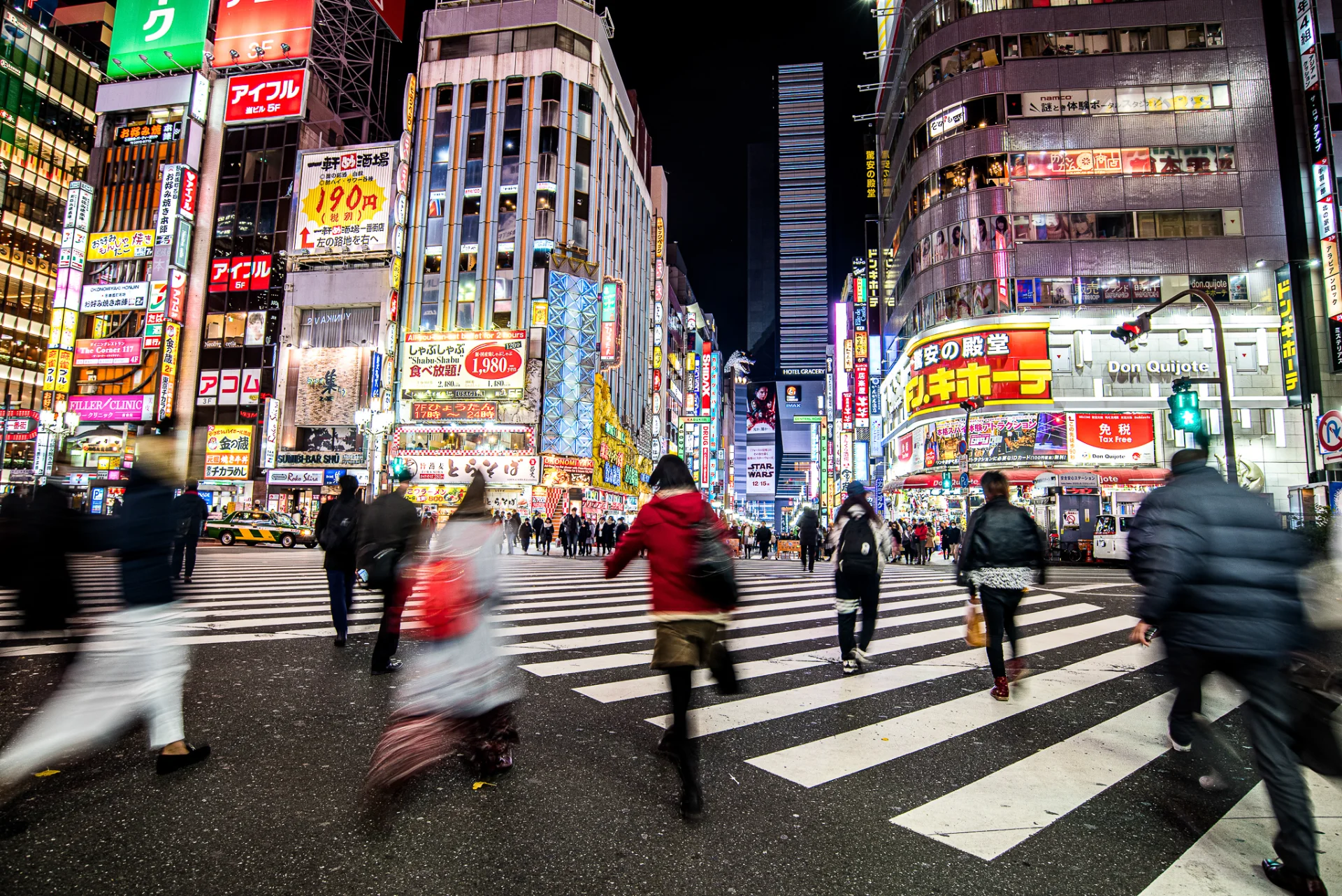 A vibrant urban photograph capturing the energy of Tokyo at night, with glowing neon signage, dynamic pedestrian movement, and a striking sense of metropolitan rhythm. Printed on paper, the work emphasizes light, motion, and the dense visual pulse of the city.