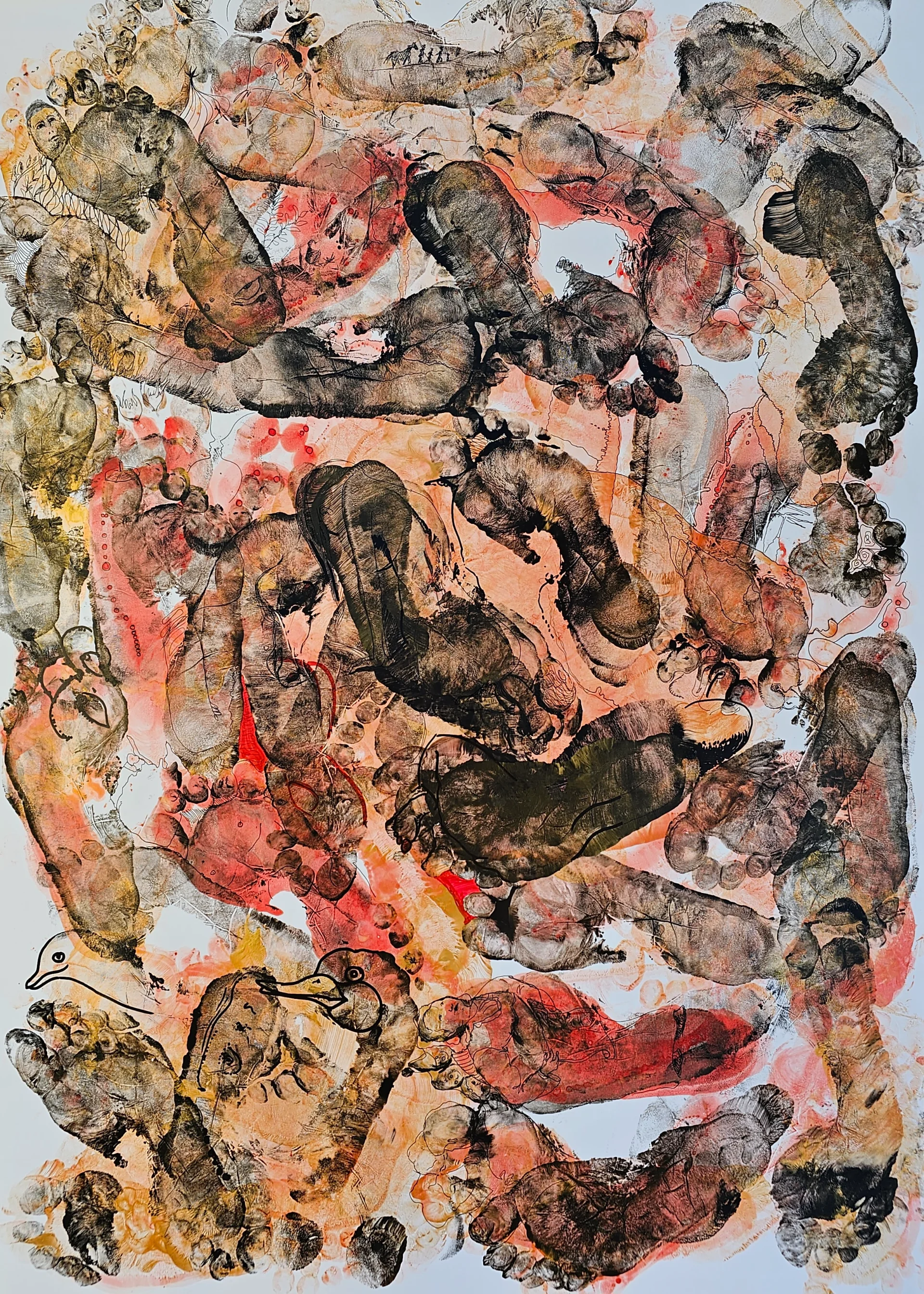 עקבות כפות רגליים בתנועה כאוטית שיוצרת דמויות שונות שמסתתרות בין הכתמים