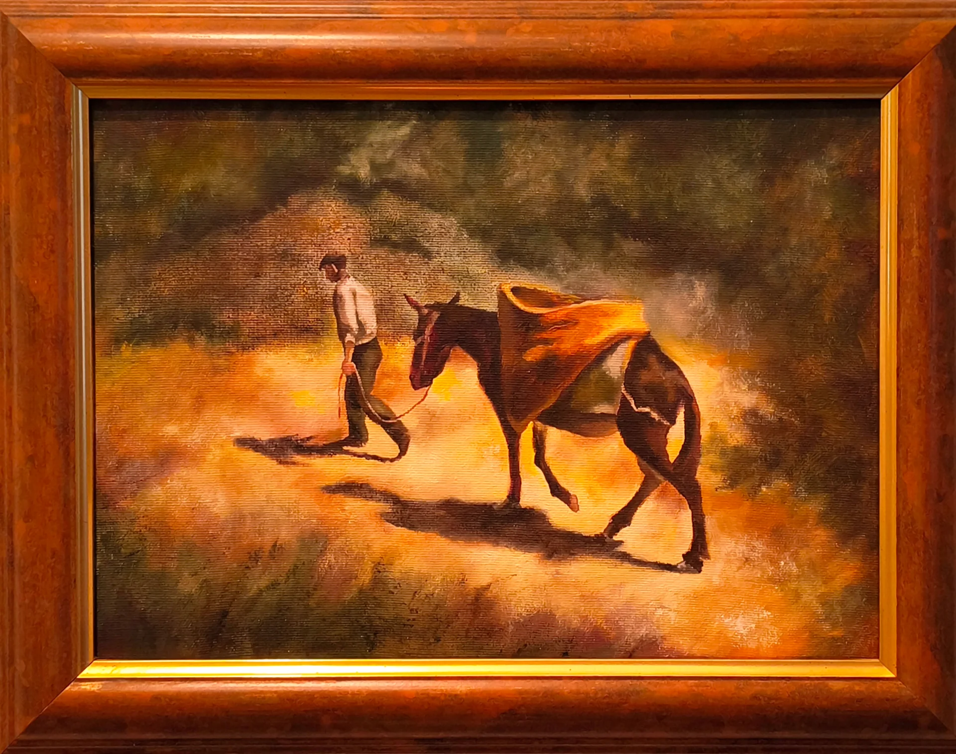 At the center of the composition, a man walks along the edge of a luminous path, holding a rope and leading a donkey draped with a warm ochre cloth. The figures move slowly through a rural landscape, surrounded by dense, shadowed vegetation, while a golden, late-afternoon light floods the ground and emphasizes their quiet forward motion. The interplay of light and shadow creates a dramatic focal point: the figures appear almost like a memory illuminated within a muted, green-brown expanse. Rooted in the tradition of rural realism, the painting carries a poetic and contemplative atmosphere. Soft brushstrokes evoke a sense of dust suspended in the air, and the warmth of the earth echoes the vibrant cloth on the donkeyโs backโa vivid accent that gently disrupts the otherwise restrained palette. The work invites reflection on journey, labor, and the rhythms of daily life, while also suggesting a deeper meditation on the relationship between human and nature. Seemingly simple, the scene holds emotional depth and quiet nostalgia, encouraging the viewer to linger in the space between light and shadow.