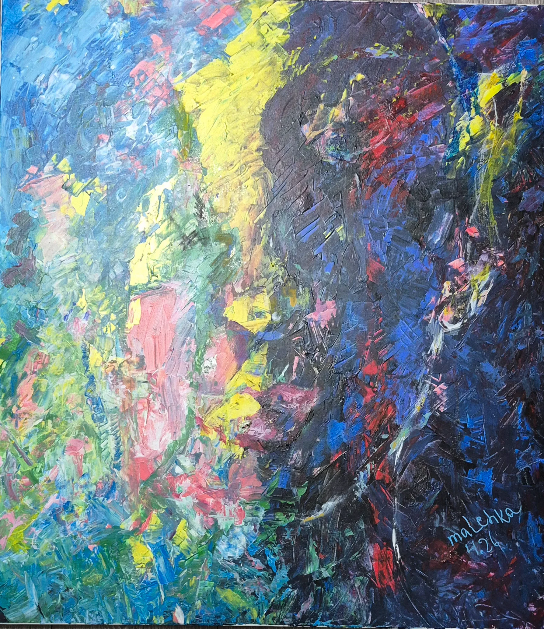 An expressive abstract composition built with bold palette-knife textures and layered brushwork. Contrasting luminous yellows, blues, pinks, and deep dark tones create a dynamic visual dialogue inspired by duality, movement, and the shifting emotional atmosphere of moonlight.