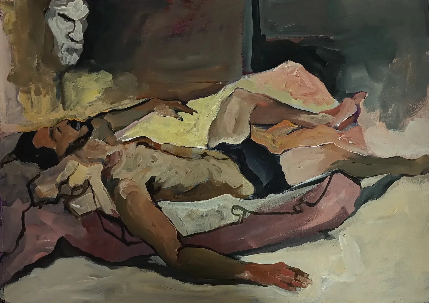 A young man wearing only underwear lies on a pouf. At first glance, the scene appears devoid of action, yet the subtle presence of a plaster satyr mask introduces a sense of covert observation. It is a gaze without a body — cold, detached, and emotionless. The contrast between the living, vulnerable body and the frozen image of the mask shifts the work into a field of tension and control. Intimacy is disrupted by the very act of being watched: the body becomes not a space of freedom, but an object of silent assessment.