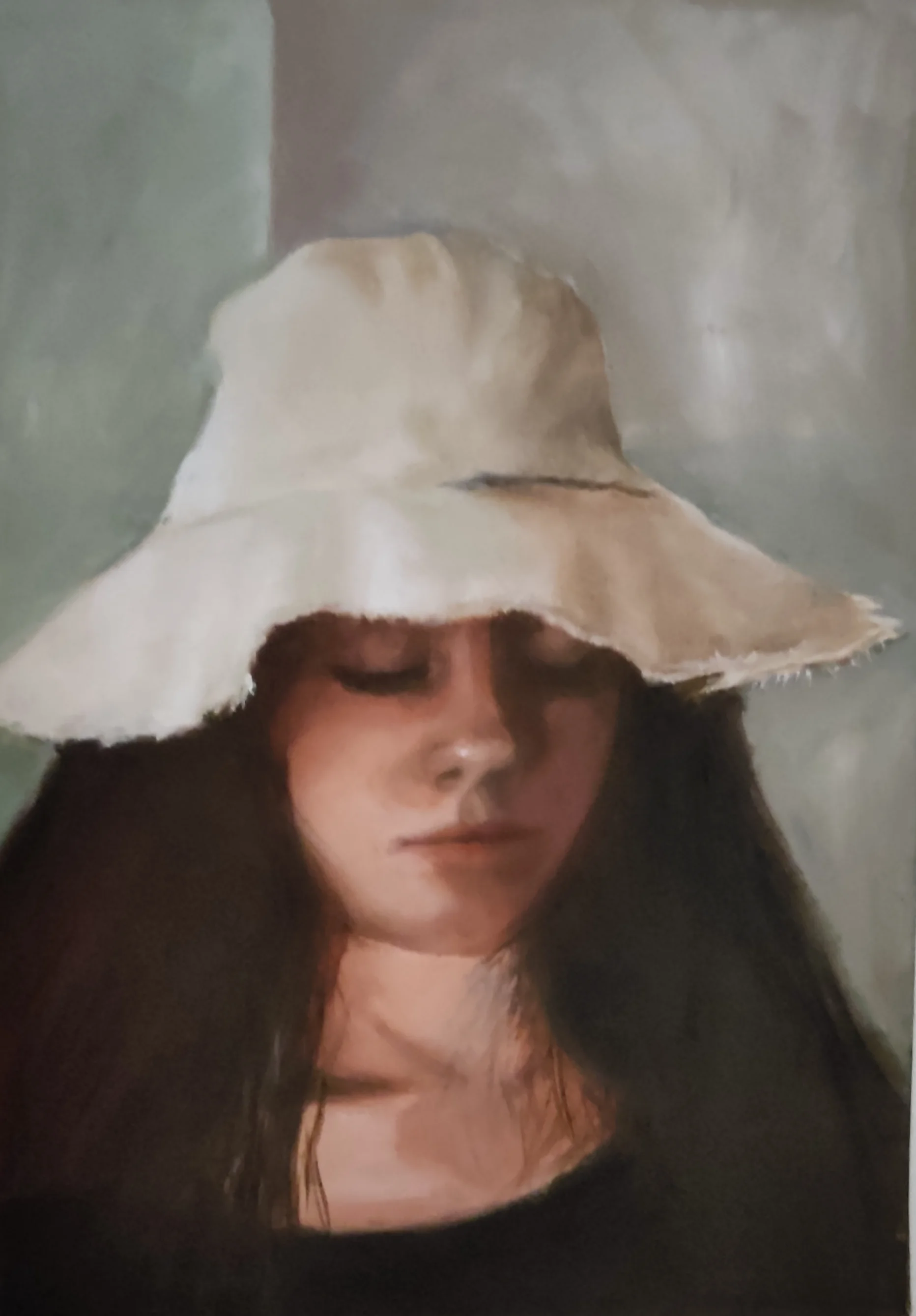 This impressionistic oil painting presents a delicate portrait of a young woman's face, partially veiled beneath a broad-brimmed white straw hat. The pale greenish background creates a soft contrast to the fine facial lines, half-closed eyes, and flowing black hair. Soft light accentuates the natural texture of the hat and skin, evoking a quiet mystery and everyday serenity.