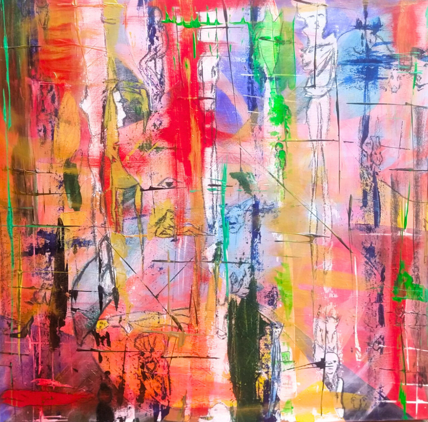 Technique in charcoal and synthetic on canvas Inflaming speaks to the experience of intense emotional states, whether it's passion, anger, love, or the heat of a moment. The subtle figures suggest that these powerful emotions are deeply human, affecting and shaping our perceptions. It's a painting that doesn't just depict "inflaming" but embodies it, drawing the viewer into its fiery, complex, and emotionally charged world.