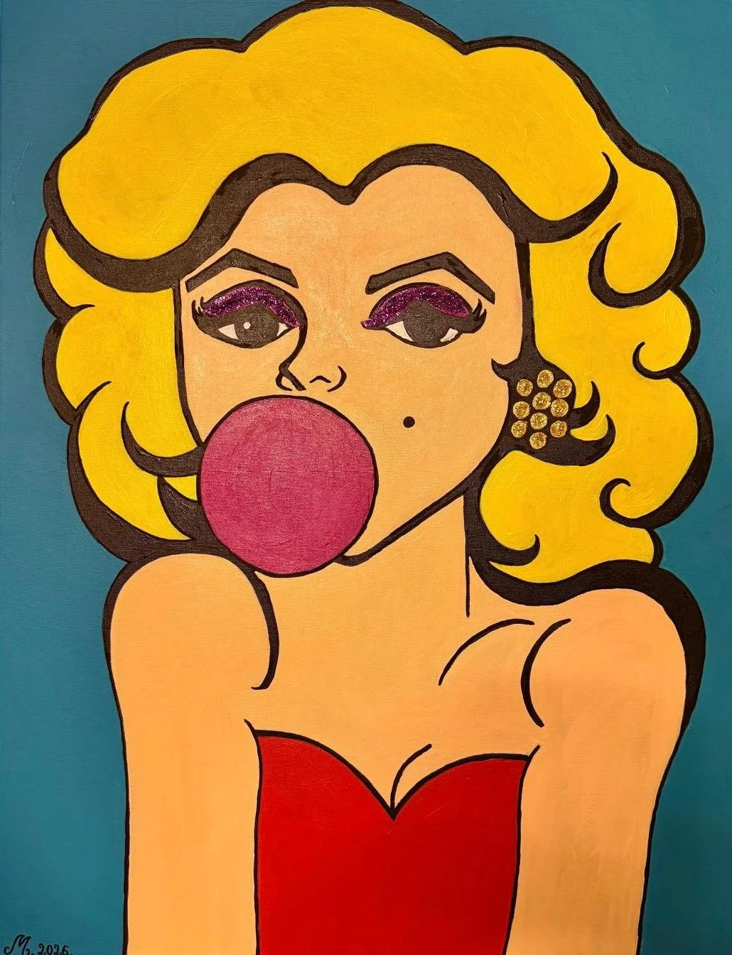 A bold pop-art portrait that reimagines a classic screen icon through vivid color, graphic linework, and a deliberately contemporary attitude. The bubble gum gesture introduces irony and playfulness, while the stylized features and glamorous palette explore the tension between public image, femininity, and authentic identity. Acrylic on canvas with a clean, high-contrast visual language inspired by both vintage iconography and modern pop culture.
