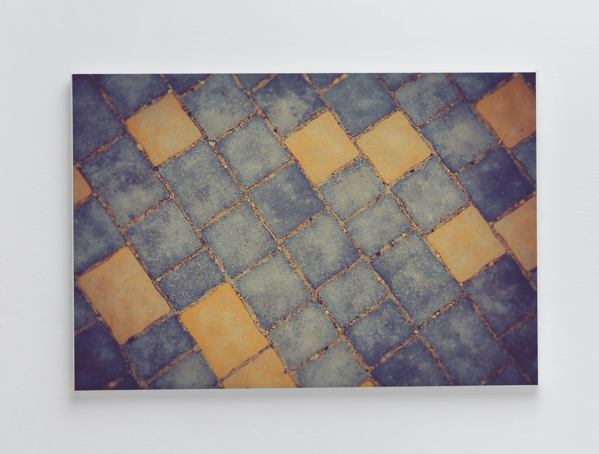 A painted sidewalk in bold yellow and blue becomes a vibrant urban surface. The minimal composition highlights color, texture, and the quiet beauty found in everyday spaces.