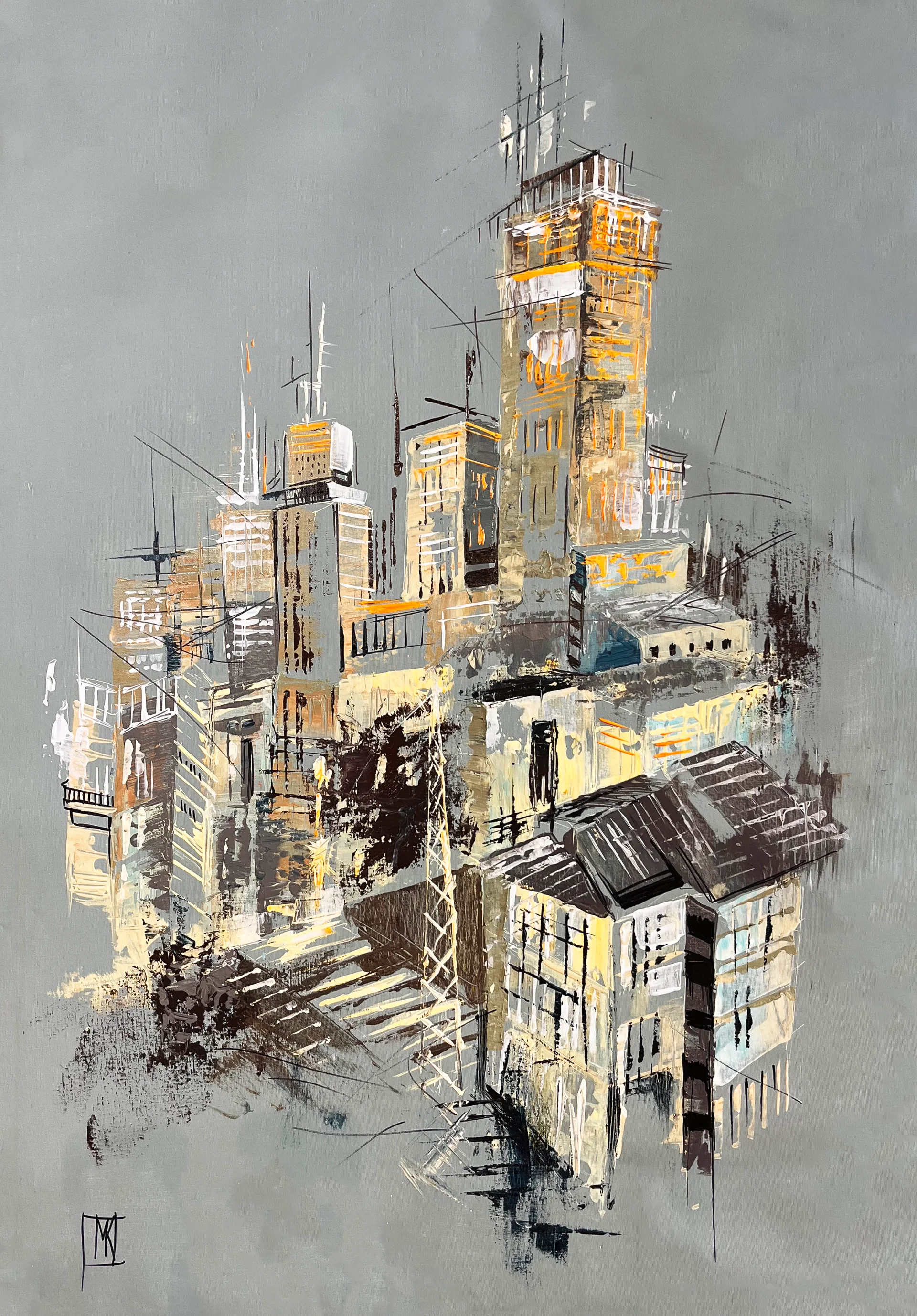 n this piece, I poured my passion for urban life into swirling layers of acrylic, blending expressionism, realism, and surrealism to capture the city's vibrant heartbeat. The dynamic lines and glowing tones evoke energy and mystery, transforming a skyline into a living symphony. This painting will bring a bold, inspiring atmosphere to your space, inviting curiosity and reflection amidst everyday life.
