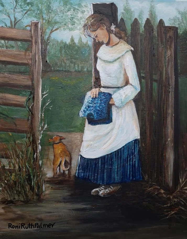 An evocative figurative painting of a young woman standing by an old courtyard gate, holding a hand-knitted blue garment close to her heart as she waits for her belovedโs return. The composition combines a quiet rural landscape, a loyal dog, and restrained color contrasts of white, blue, and earthy browns to convey tenderness, longing, and hope. Painted in a narrative, romantic style, the work explores themes of devotion, memory, and the emotional stillness of waiting. Includes frame; external dimensions with frame add approximately 10 cm on each side.