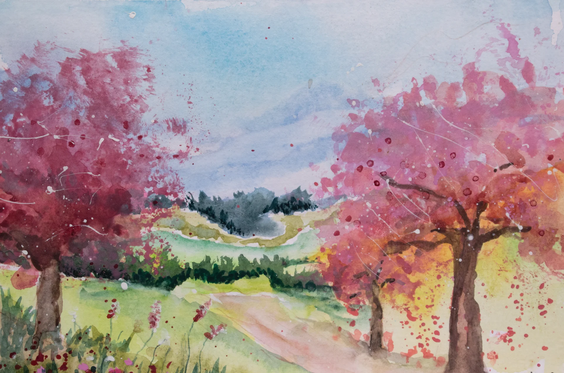 A dreamy spring landscape with blooming trees and a soft path leading through nature, painted in watercolor