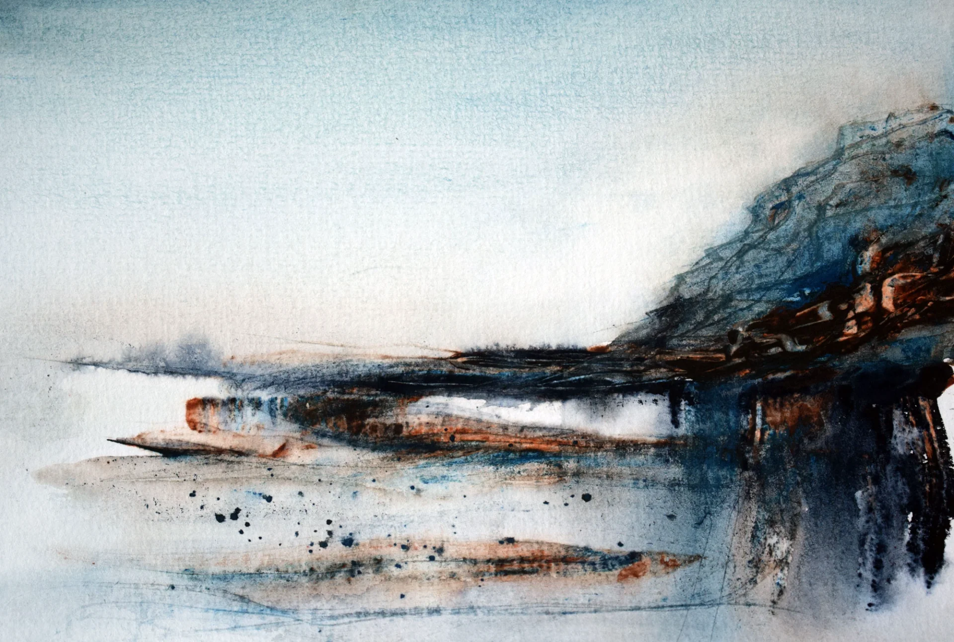 Moody rustic watercolor painting of a winter seascape