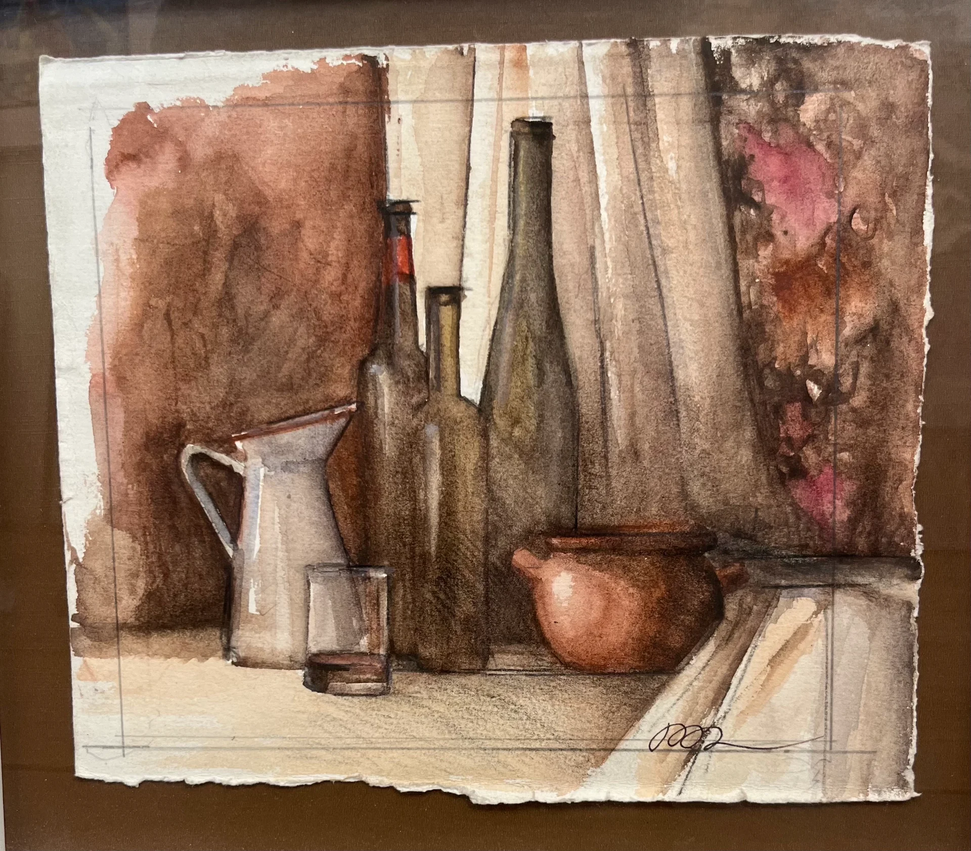 An inviting watercolor featuring wine bottles, a jug, and a clay pot. Framed with burnt umber mat and white frame