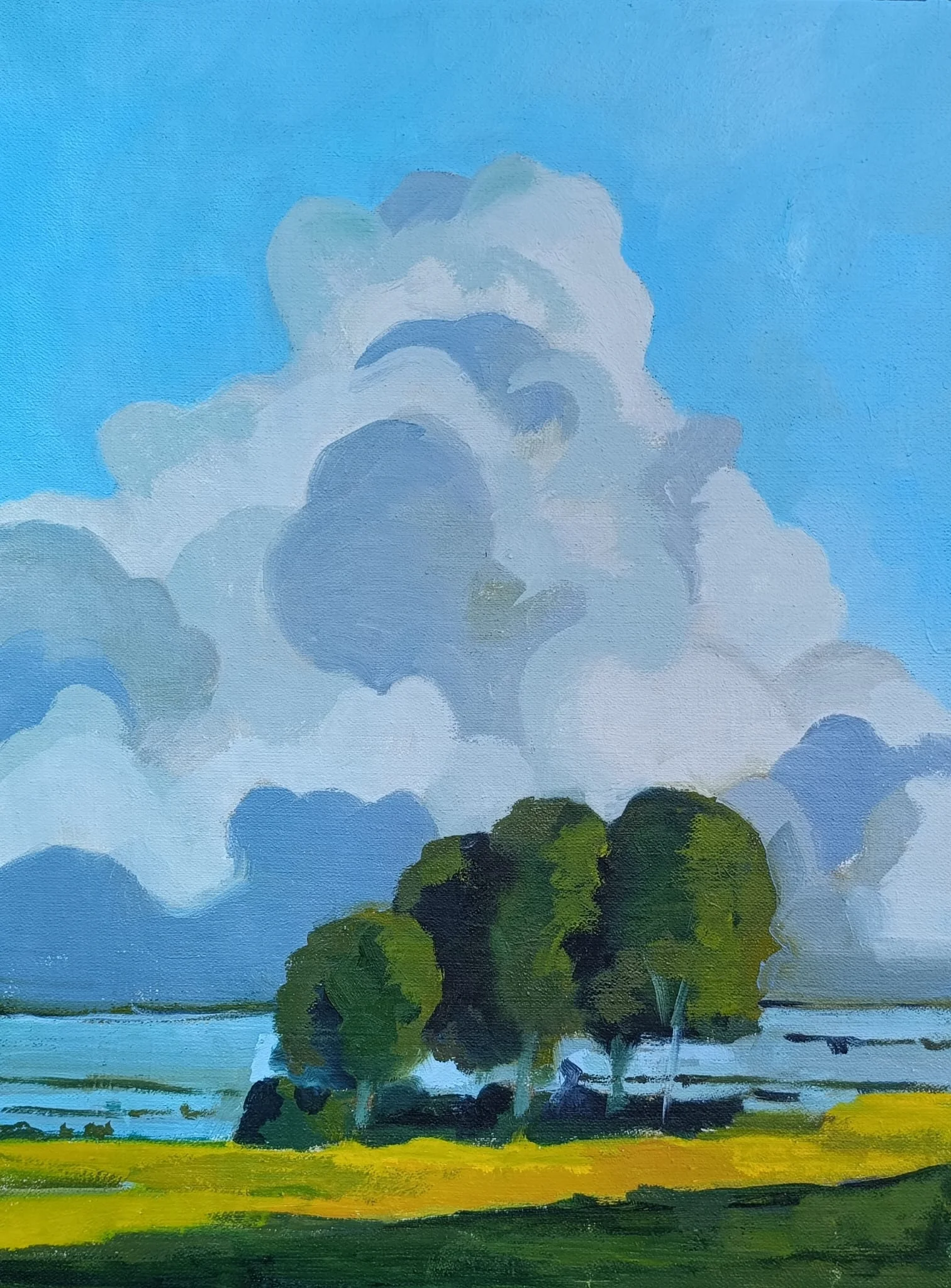 Towering summer clouds rise above a yellow-green field, with a small cluster of trees adding a quiet focal point. The painting evokes a sense of calm, open space, and peaceful nature.