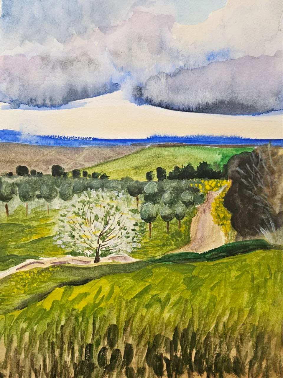Soft hills, a winding path, and blooming trees create a sense of calm and openness. This work reflects the gentle rhythm of nature and the quiet strength of life unfolding