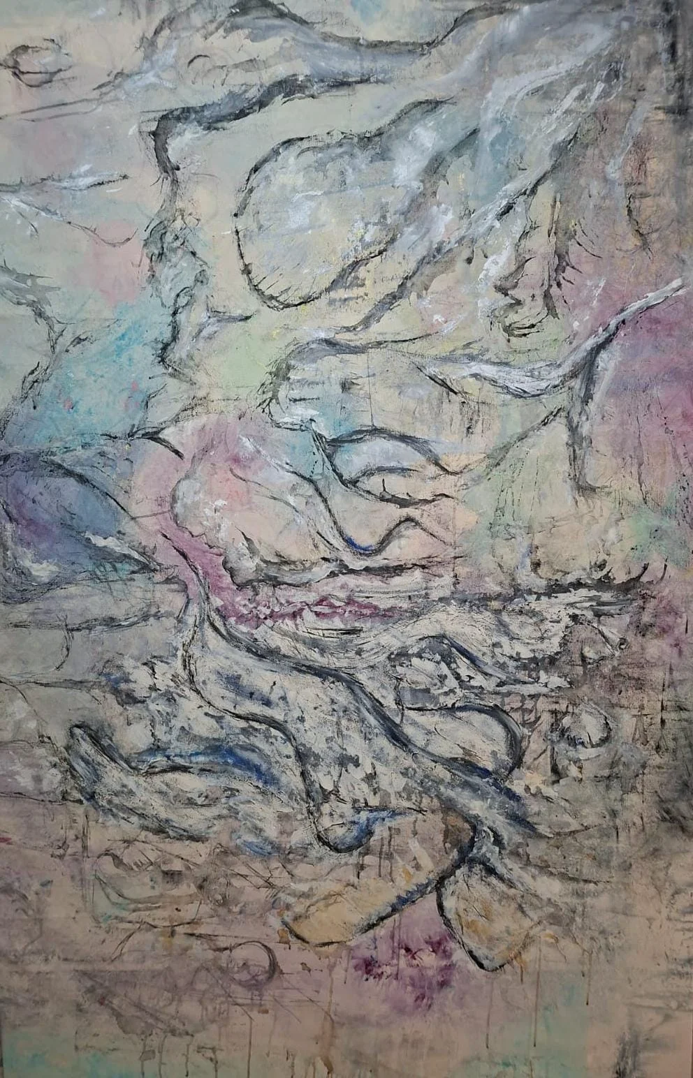 Creating in layers with a variety of materials, charcoal powders with acrylics, gouache and oil meet design pastes, working on emotional boundaries