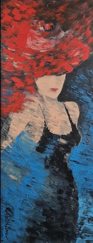 Original painting of an elegant woman with a large red hat and a black dress in an abstract style and freehand brushstroke technique.