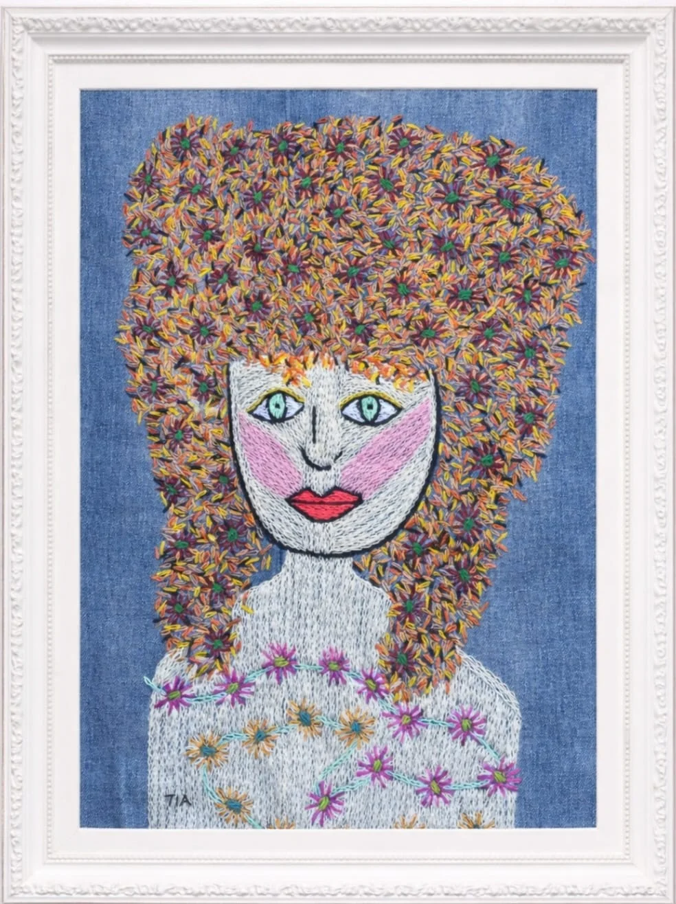 דיוקן אישה ברקמה בעבודת יד על בד ג'ינס ממוחזר *המסגרת להמחשה בלבד*