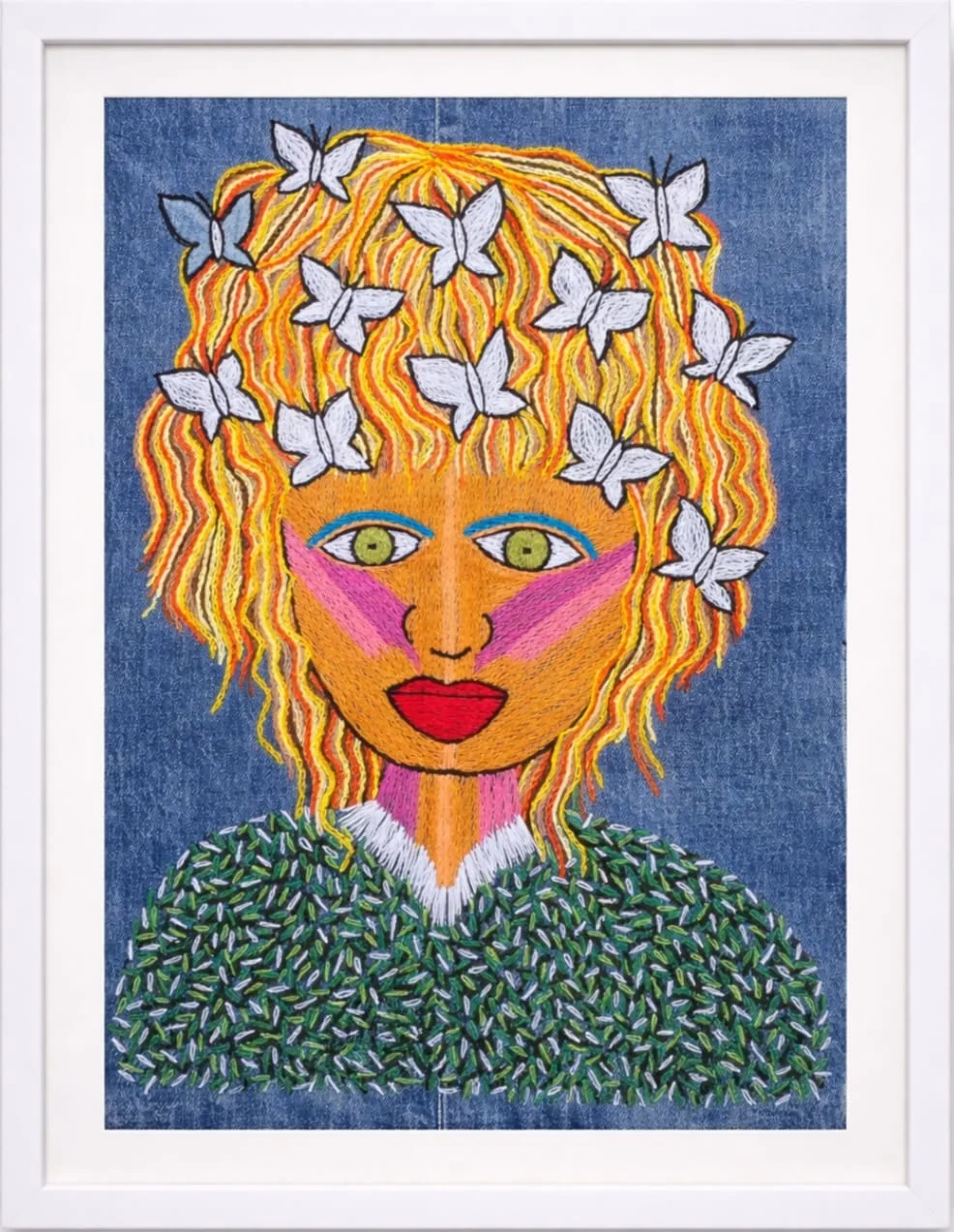 דיוקן אישה ברקמה בעבודת יד על בד ג'ינס ממוחזר *המסגרת להמחשה בלבד*