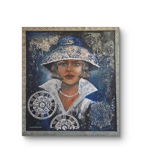 יצירה מקורית גדולה ועוצמתית בטכניקה מעורבת, המשלבת עומק מרקמים, שכבות צבע ועיטורים עשירים בגווני כחול, לבן ושחור. במרכז היצירה מופיעה דמות נשית מסתורית ואלגנטית, עטופה ביופי על-זמני, כאשר סביבה שעונים ומוטיבים דקורטיביים המסמלים את זרימת הזמן, זיכרונות ורגעים שנשמרו לנצח. הציור יוצר נוכחות דרמטית ומרשימה בכל חלל – סלון, משרד, גלריה או פינת אירוח יוקרתית. שילוב הטקסטורות והפרטים מעניק תחושת עומק ותנועה, וכל מבט מגלה שכבה חדשה של קסם וסיפור. היצירה מגיעה עם מסגרת עץ מעוצבת, המשלימה את המראה האלגנטי ומוכנה לתלייה. ציור יחיד מסוגו, חתום בידי האמנית רוני רות פלמר