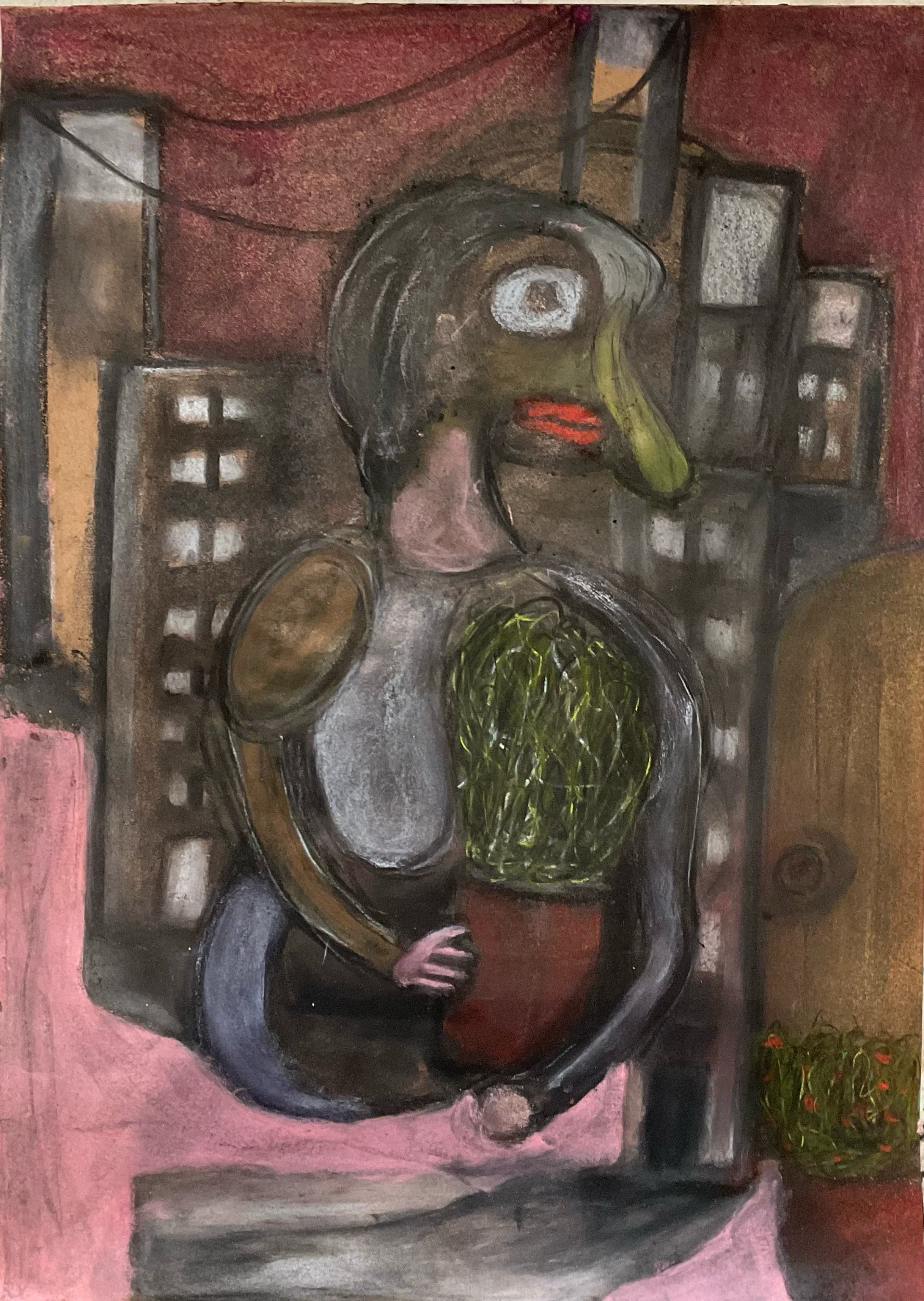 רישום בפחם וגירי פסטל על גבי נייר חום