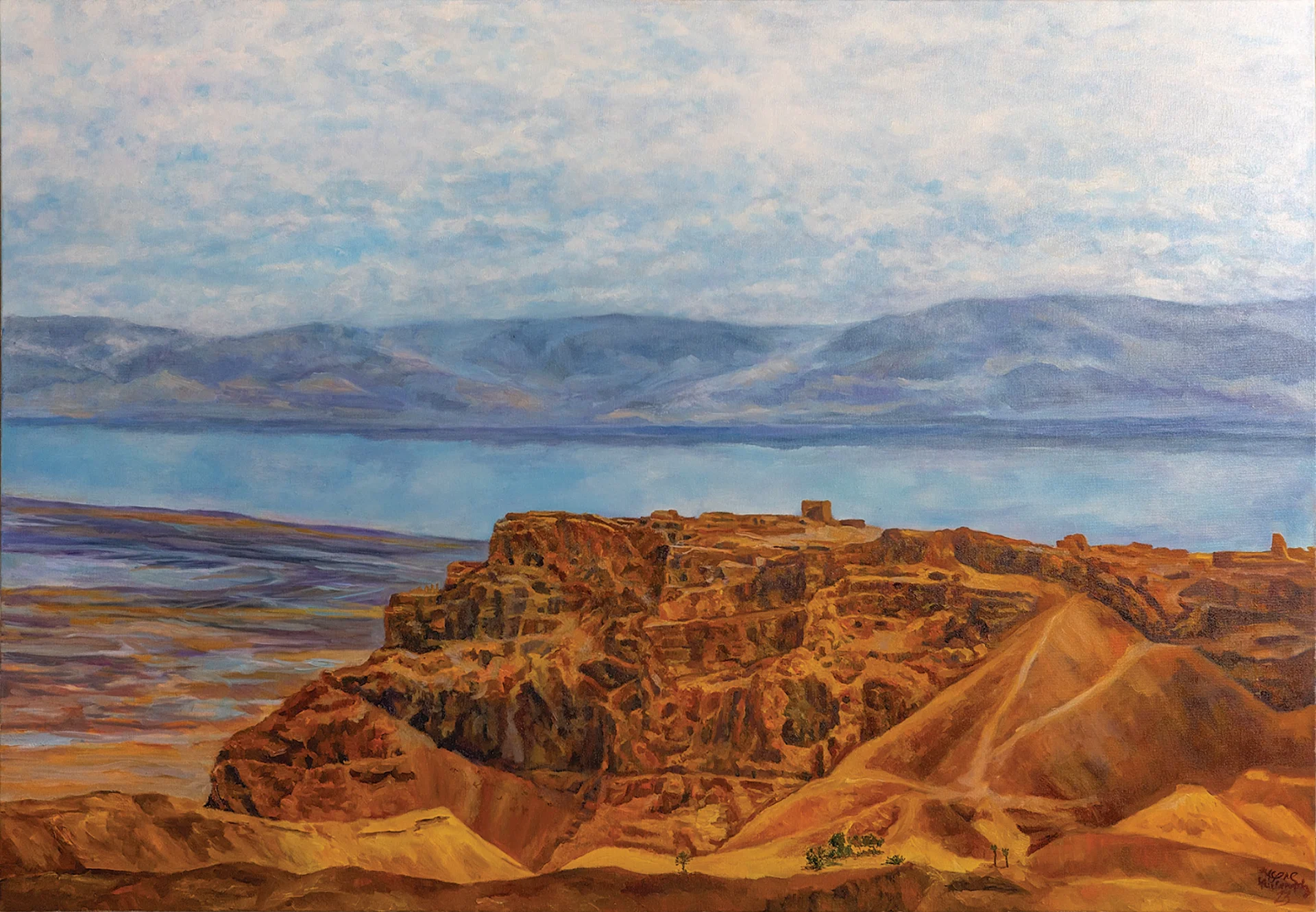 ציור שמן מרהיב המתאר את מצדה המתנשאת מעל המרחבים הכחולים והשקטים של ים המלח. גווני אוכרה, חלודה וזהב מדגישים את הדרם של המצוק המדברי, בעוד ההרים הרחוקים נטמעים בגוני כחול וסגול רכים. הקומפוזיציה יוצרת ניגוד מרשים בין הנוף הצחיח והעתיק לבין האופק השלו והאינסופי. מחווה שקטה ומלאת יופי לאחד מאתרי הטבע וההיסטוריה המרגשים בישראל.