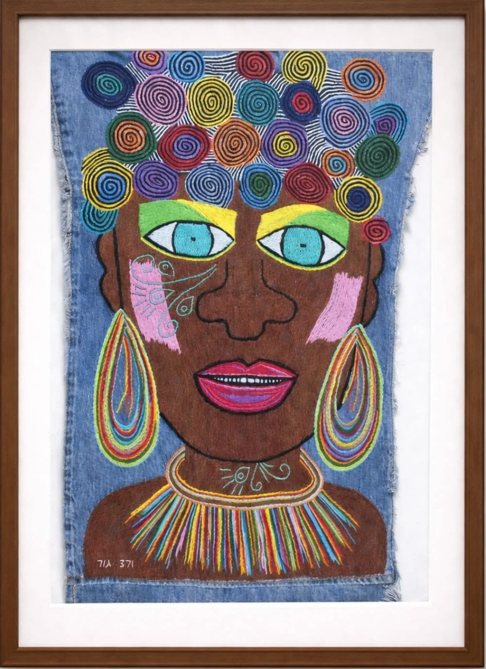 דיוקן אישה ברקמה בעבודת יד על בד ג'ינס ממוחזר *המסגרת להמחשה בלבד*