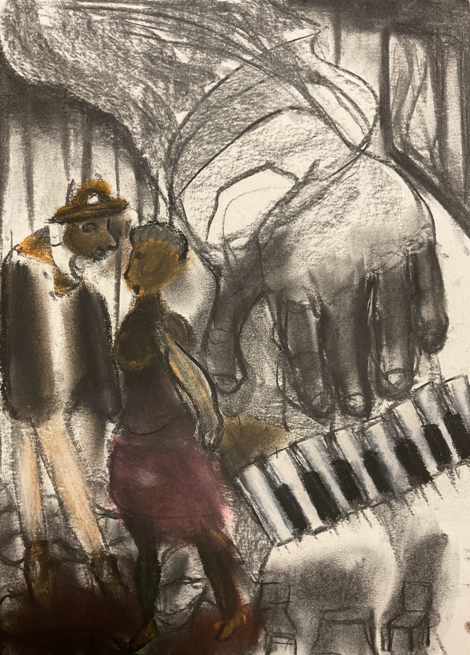 רישום בפחם וגירי פסטל על גבי נייר חום