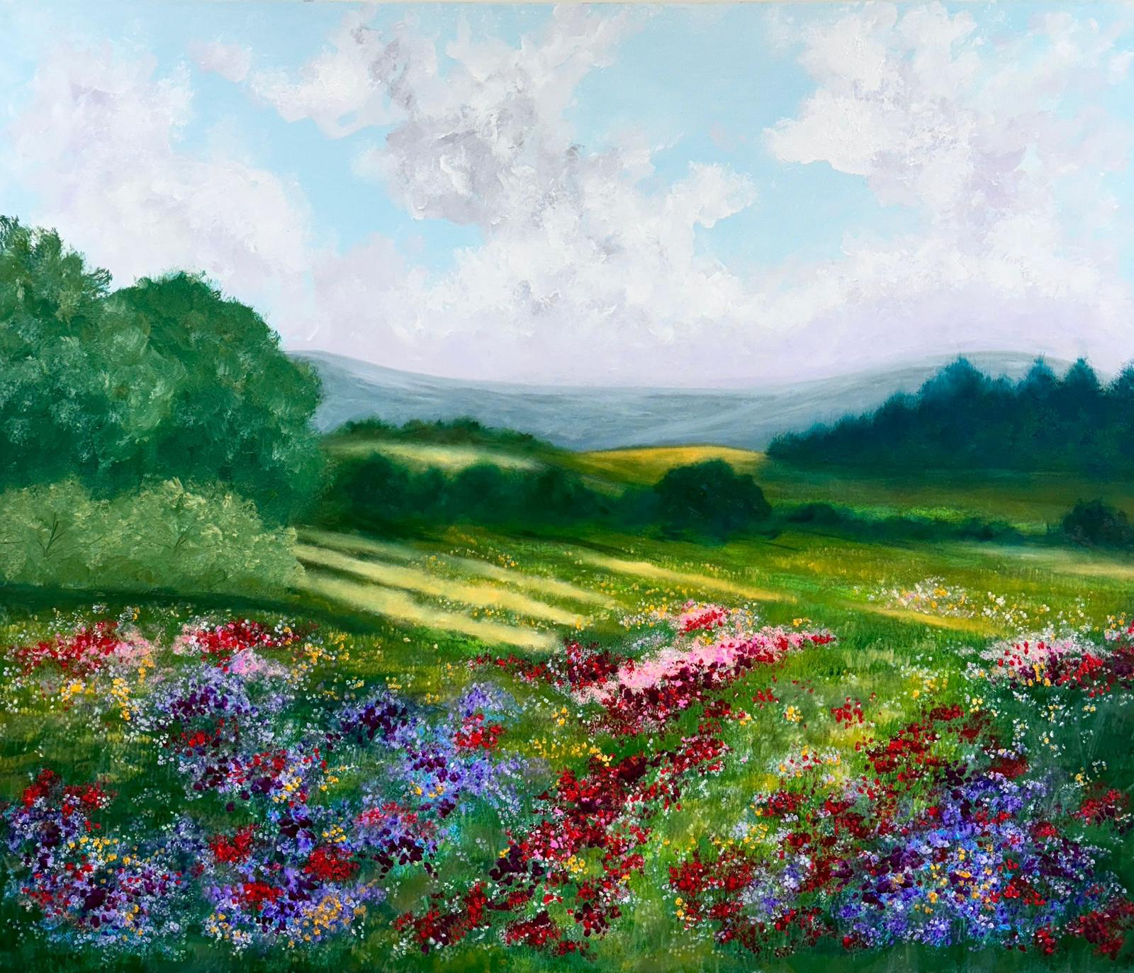 שדה פרחים צבעוני מתרחב אל גבעות ירוקות תחת שמיים בהירים, ברגע של אור רך ושלווה טבעית.