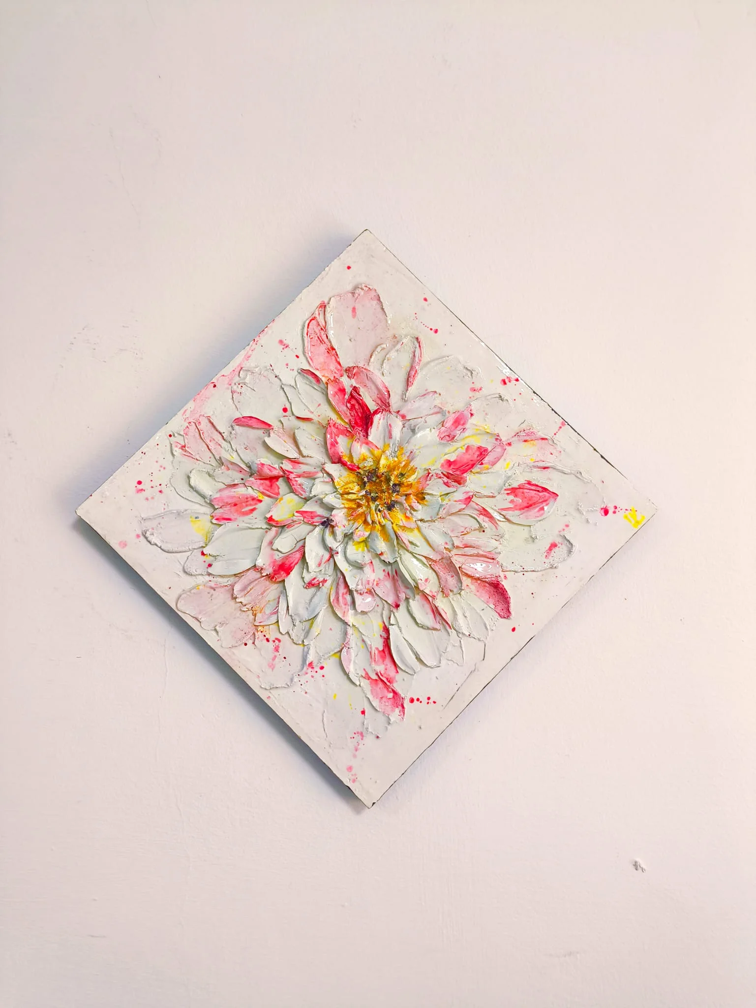 עבודת שפכטל תלת־ממדית על קנבס, המציגה פרח גדול המתפזר על פני הבד בשכבות עלי כותרת עשירות ומוגבהות. הגוונים הלבנים והוורודים משתלבים זה בזה ברכות, בתוספת נגיעות צהובות במרכז, המעניקות תחושת אור והתעוררות. ניתן להזמין בכל הגדלים