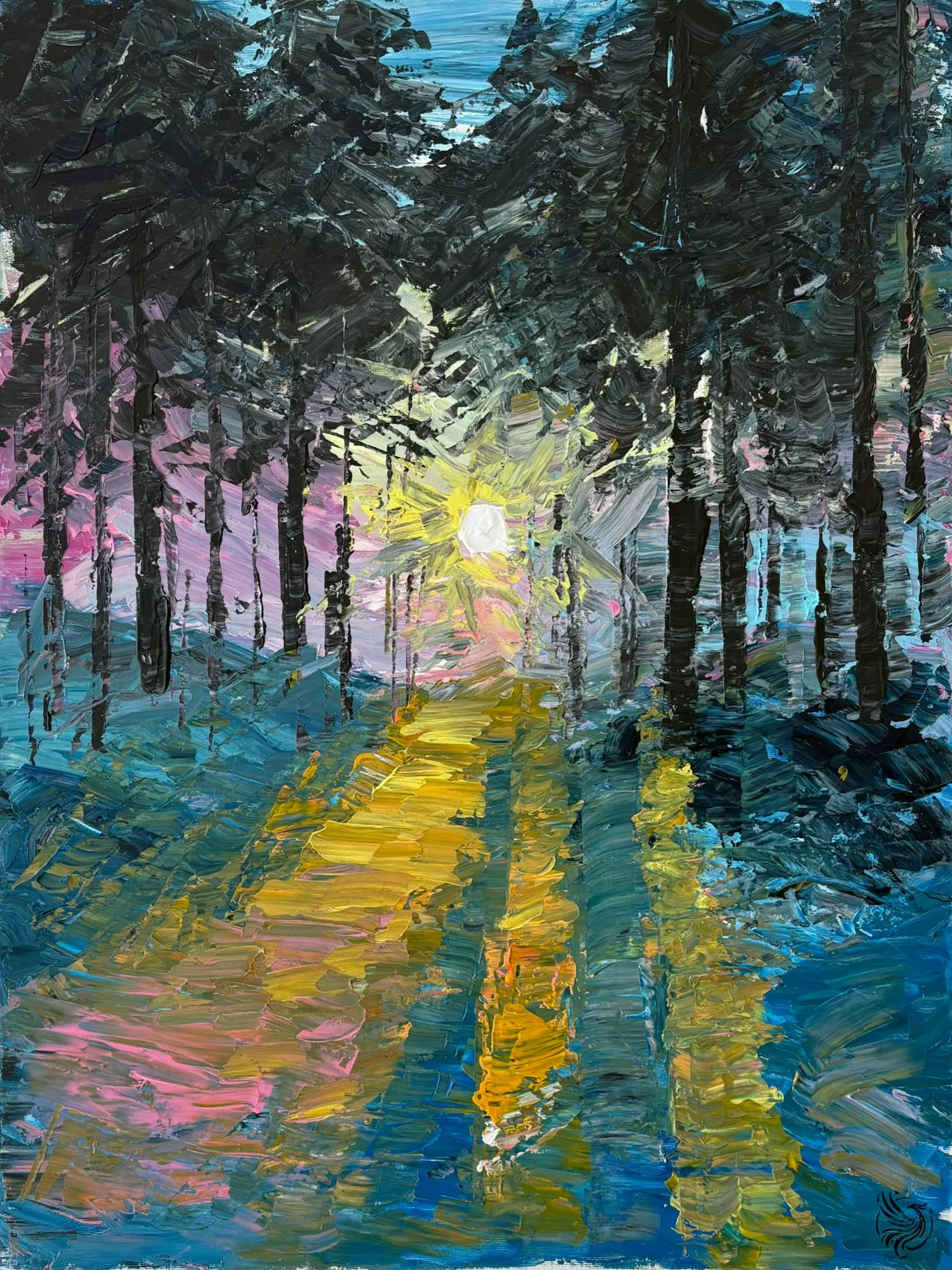 יצירה שנוצרה כולה בשפכטל בלבד! יש משהו פשוט וכל כך כיף בציור בעבודה עם שפכטל, ציור שמציג בתוכו קרני שמש חודרים לתוך יער