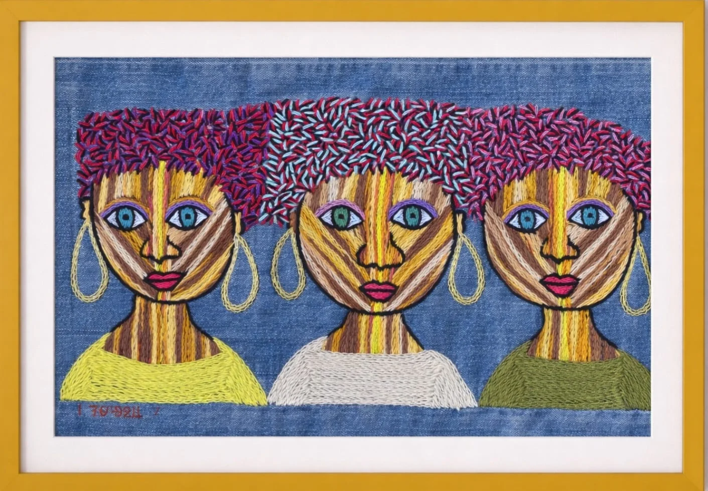 דיוקן אישה ברקמה בעבודת יד על בד ג'ינס ממוחזר *המסגרת להמחשה בלבד*