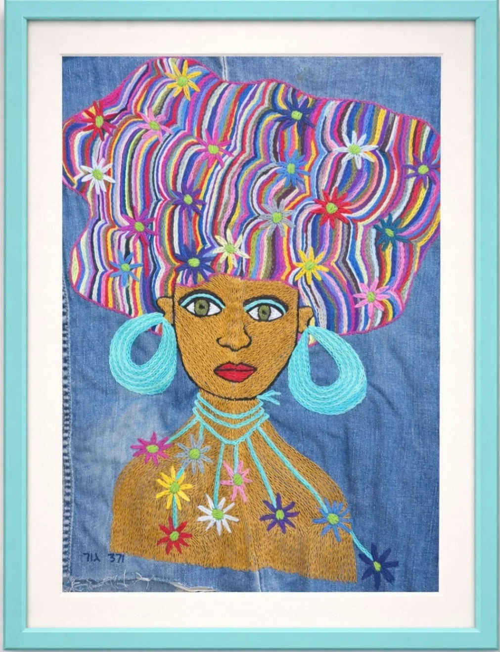 דיוקן אישה ברקמה בעבודת יד על בד ג'ינס ממוחזר *המסגרת להמחשה בלבד*